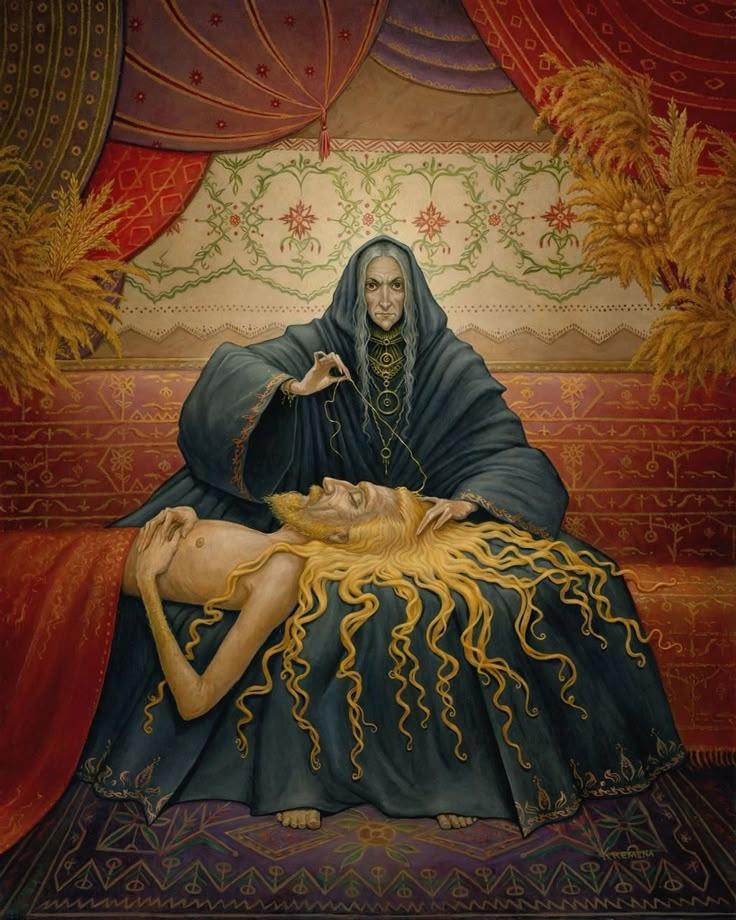 Работа болгарской художницы Kremena Chipilova, называется "Три золотых волоска", и эту сказку или похожую, про то, как надо добыть три волоска Солнца, многие где-то да читали/слышали.