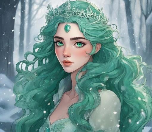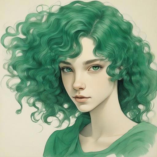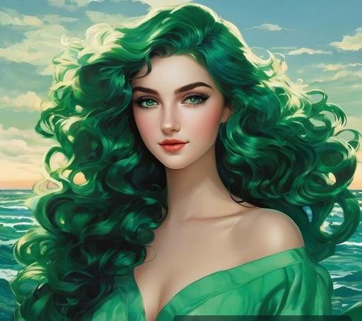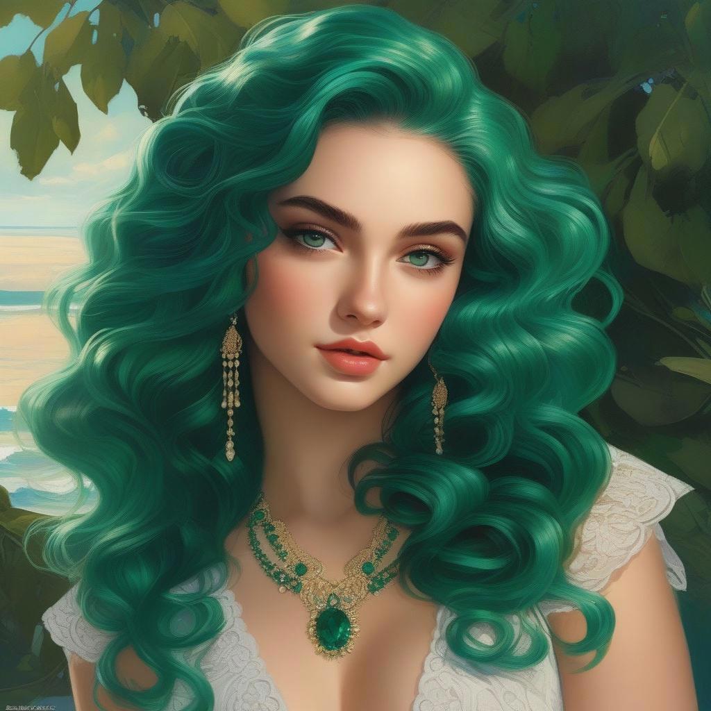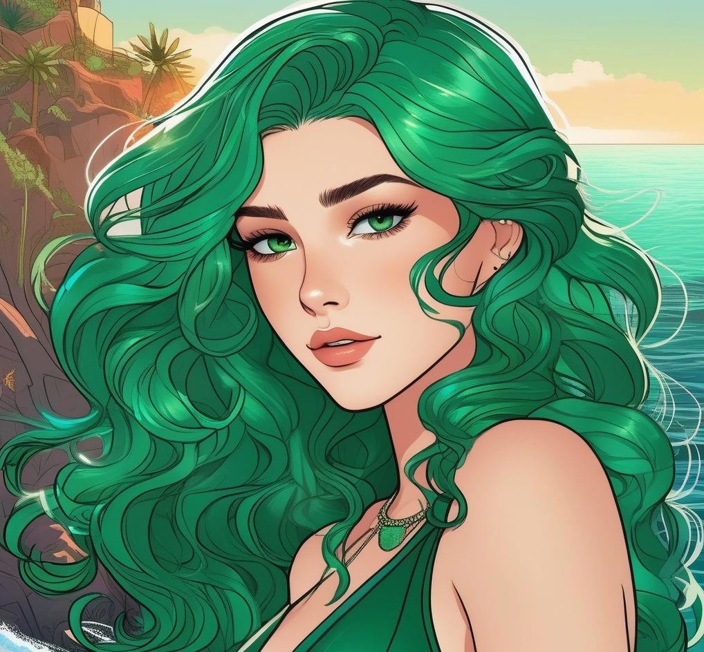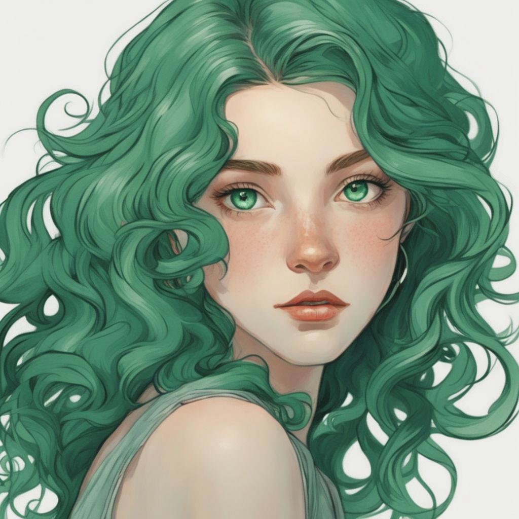 Семнадцатилетняя девушка с волнистыми изумрудными волосами чуть ниже плеч и глазами цвета морской волны