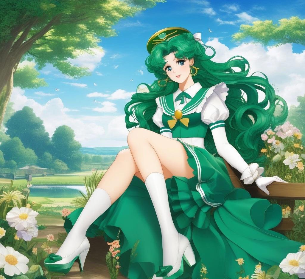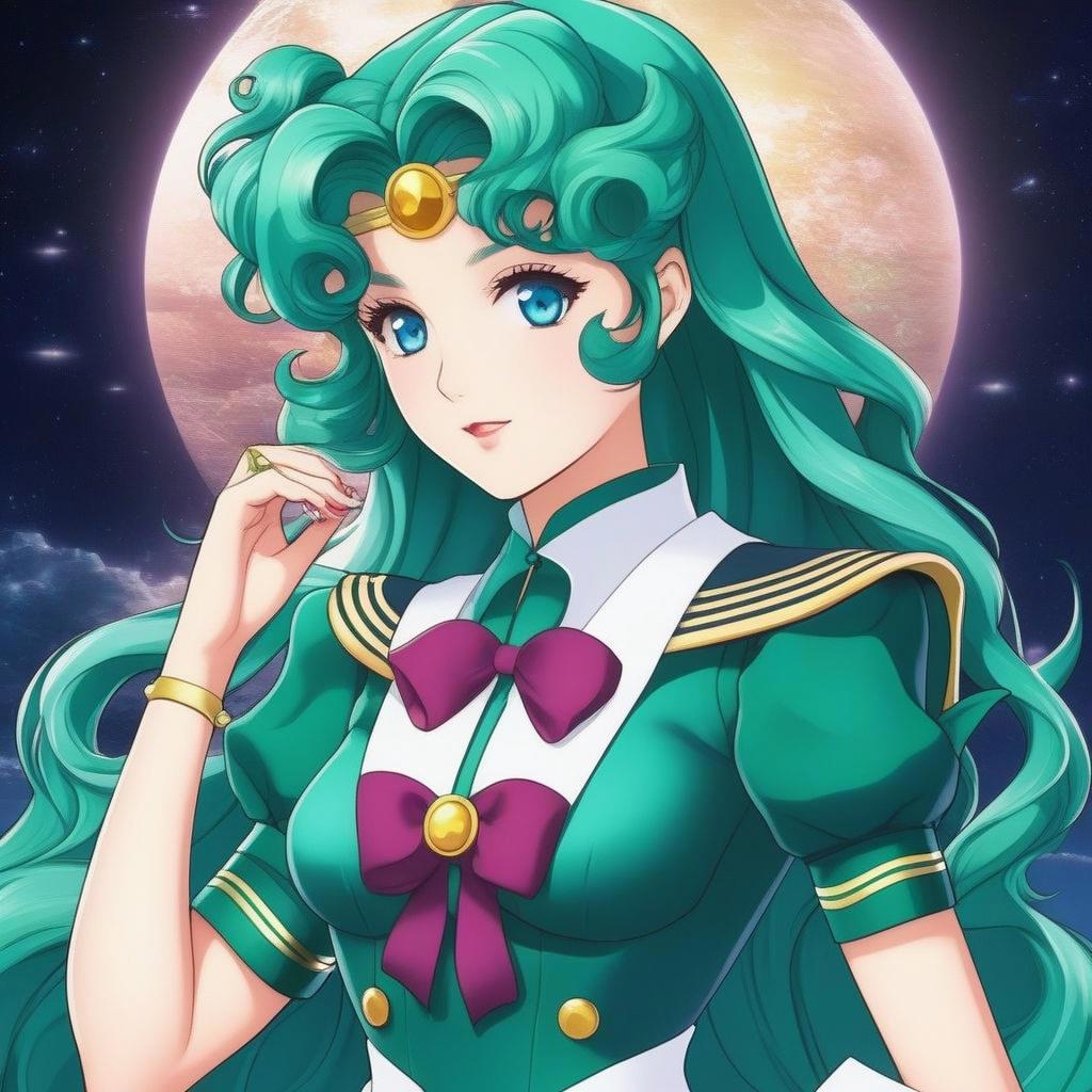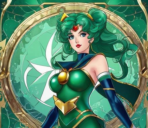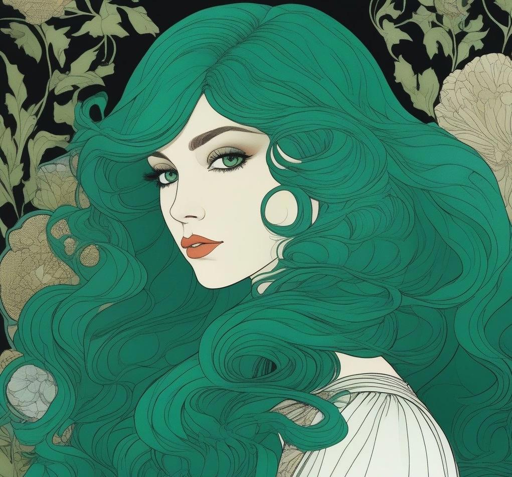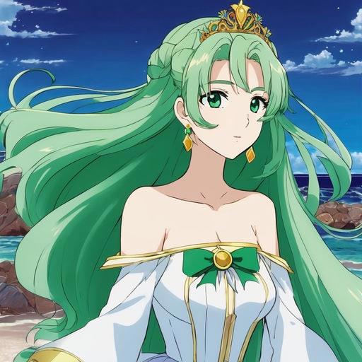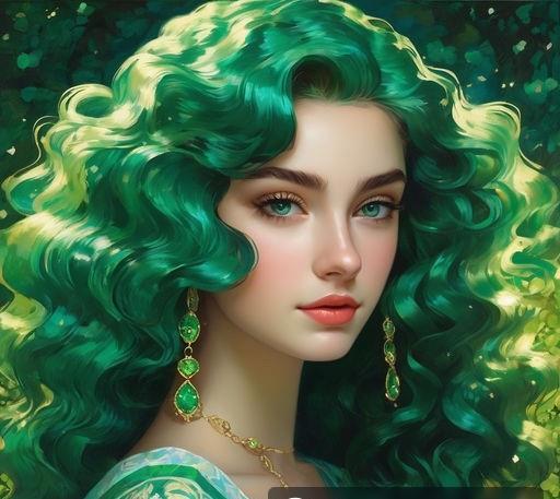 Семнадцатилетняя девушка с волнистыми изумрудными волосами чуть ниже плеч и глазами цвета морской волны