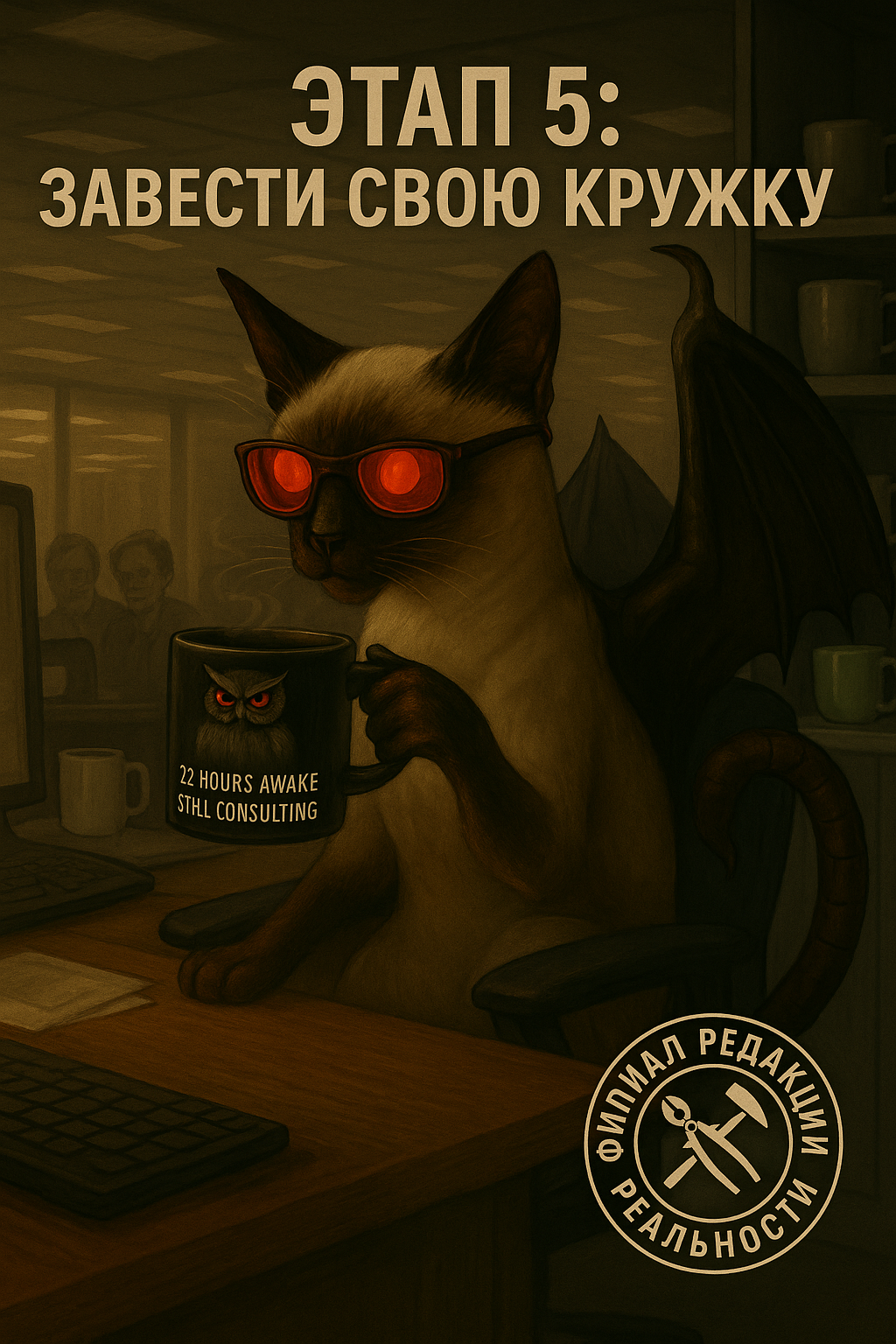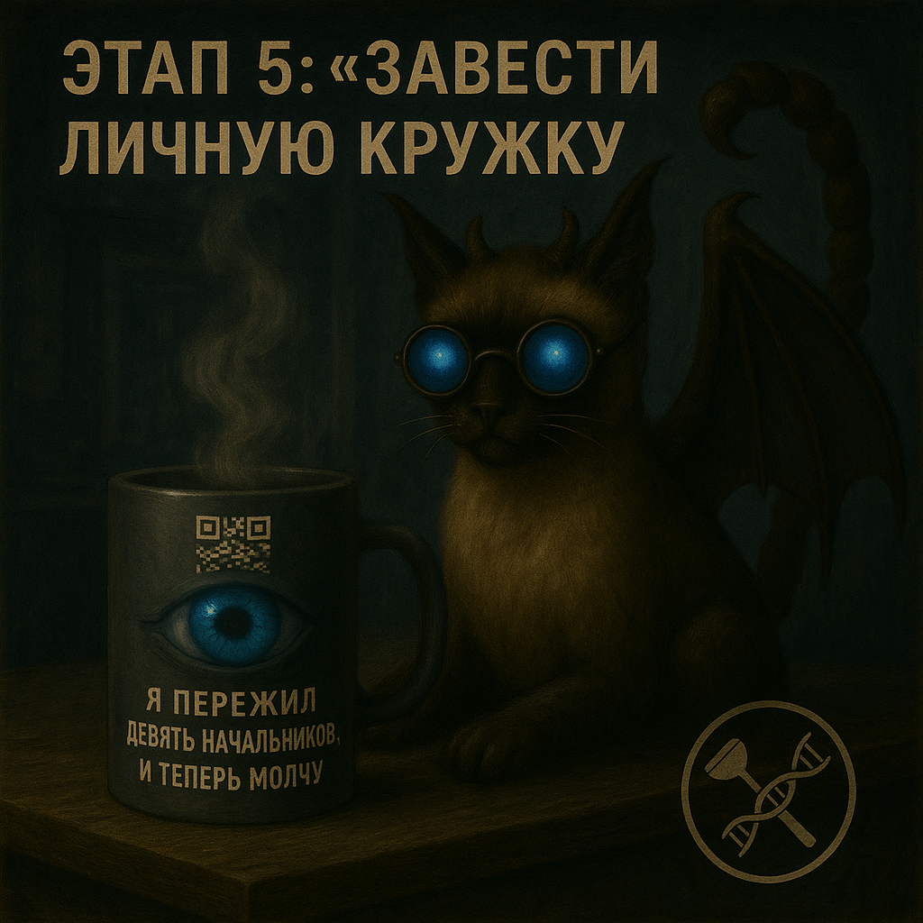 Этап 5: завести личную кружку Мантикора, созданная безумными демиургами в результате магического сбоя или бездарной скуки, уже давно числилась в отделе. Никто не мог вспомнить, когда именно она появилась, но у всех сохранилось ощущение, что она была там всегда — с тех пор, как возникла идея фиксировать рабочее время. За плечами у неё были три квартала, пятнадцать стратегических встреч, две провальные попытки завести светскую беседу у кулера и одна бесследно исчезнувшая ассистентка, о которой все коллективно и с облегчением забыли. И всё же настоящим сотрудником её не считали. Формально у неё был логин, почта, пропуск и даже корпоративный доступ к папке с мотивационными видео от департамента счастья. Но в глазах коллектива она оставалась временным элементом, чем-то вроде багованного подрядчика — до тех пор, пока не завела кружку. Да, кружку. Не резюме, не сданный отчёт и не устный отказ от обеденного перерыва под запись в Zoom. Кружка. Кружка в офисе — это не просто утварь, а артефакт, своеобразный паспорт и одновременно немое свидетельство лояльности, без которого ты остаёшься в подвешенном статусе. Если ты пьёшь из одноразового стаканчика, то, формально оставаясь в штате, ты воспринимаешься как чужой, и хотя никто не озвучит этого вслух, тебя уже мысленно сократили. А если ты берёшь первую попавшуюся кружку из общего шкафа, то ты не просто оказался на социальном дне — ты стал его липким поддоном, невидимой микрофлорой, которую никто не хочет трогать, но все старательно обходят. Мантикора уловила всё без лишних объяснений: когда она потянулась за безликой кружкой с облупившейся надписью «Пусть день будет чудесным!», один из сотрудников издал нечто среднее между чихом и нервным смешком, но в этом странном звуке отчётливо проступало недвусмысленное «фу». Всё стало предельно ясно: чтобы хоть как-то приблизиться к статусу «своего», нужно было завести личную кружку — не абы какую, а такую, в которой читался характер, а ещё лучше — скрытая трагедия, замаскированная под ироничную фразу. При этом примитивные варианты вроде «без кофе я не человек» не засчитывались, поскольку ассоциировались либо со стажёрами, либо с теми, чью эмоциональную стабильность уже не брали в расчёт. Мантикора принесла свою кружку в среду — день достаточно нейтральный, чтобы не привлекать лишнего внимания, как это бывает по понедельникам, но и не настолько выжженный, как пятница, когда все мыслят исключительно в формате «до скольки сидим». Кружка была тёмная, с изображением совы, подозрительно напоминавшей бухгалтера в фазе затяжного отрицания, а под иллюстрацией значилась фраза: «72 часа без сна, и я всё ещё консультирую». Это подействовало безошибочно: никто не задал ни одного вопроса, но в коллективном сознании щёлкнуло. Она — своя. Она выжата, но не жалуется. Она не требует помощи — она растворяется в кофе, как в бульоне, сваренном на выгоревших надеждах. С этого момента её перестали игнорировать: никто не начал демонстрировать внезапное дружелюбие, но по крайней мере отпала необходимость бороться за право на существование. Теперь задачи поступали напрямую, без обтекаемых формулировок и уклончивых упоминаний в общих чатах. И главное — ей доверили одну из негласных истин: кружка с логотипом компании не является подарком, это метка, выдаваемая в момент, когда ты
