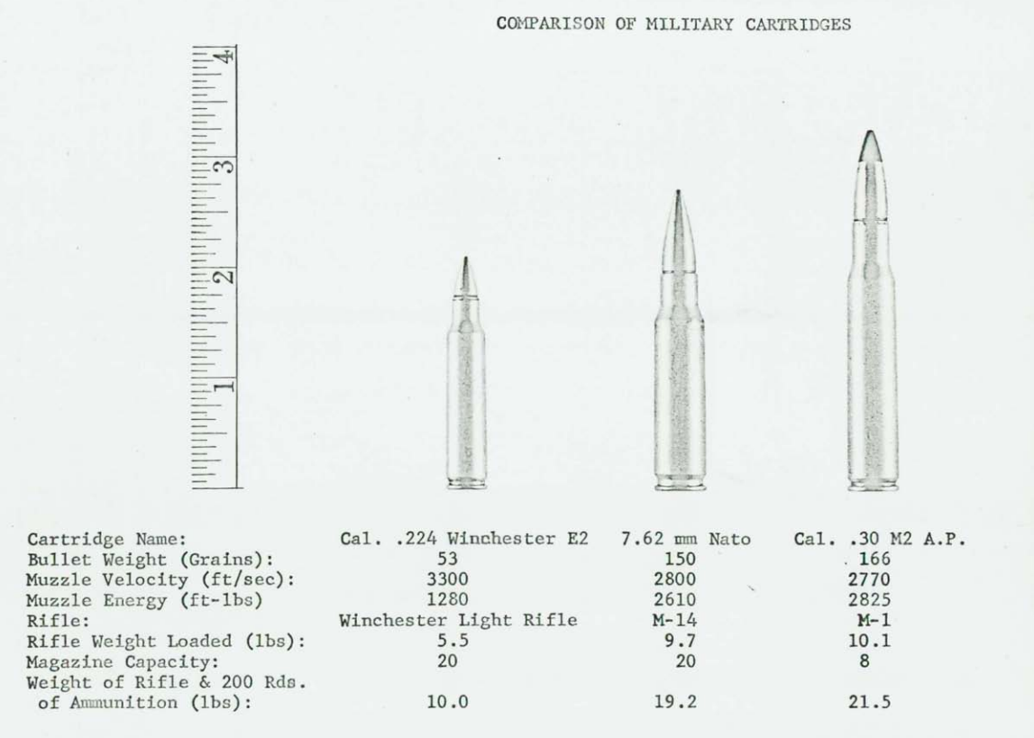 Через несколько лет к ним добавилась еще одна концепция – small-caliber high-velocity, малый калибр высокая скорость. Принято считать, что работы по ней начались в 1957 году, когда штаб командования Континентальной армии США (CONARC), руководимый генералом Уиллардом Вайманом, направил в управление пехоты (Infantry Board) письмо с названием «Изучение военных характеристик высокоскоростной и малокалиберной винтовки».