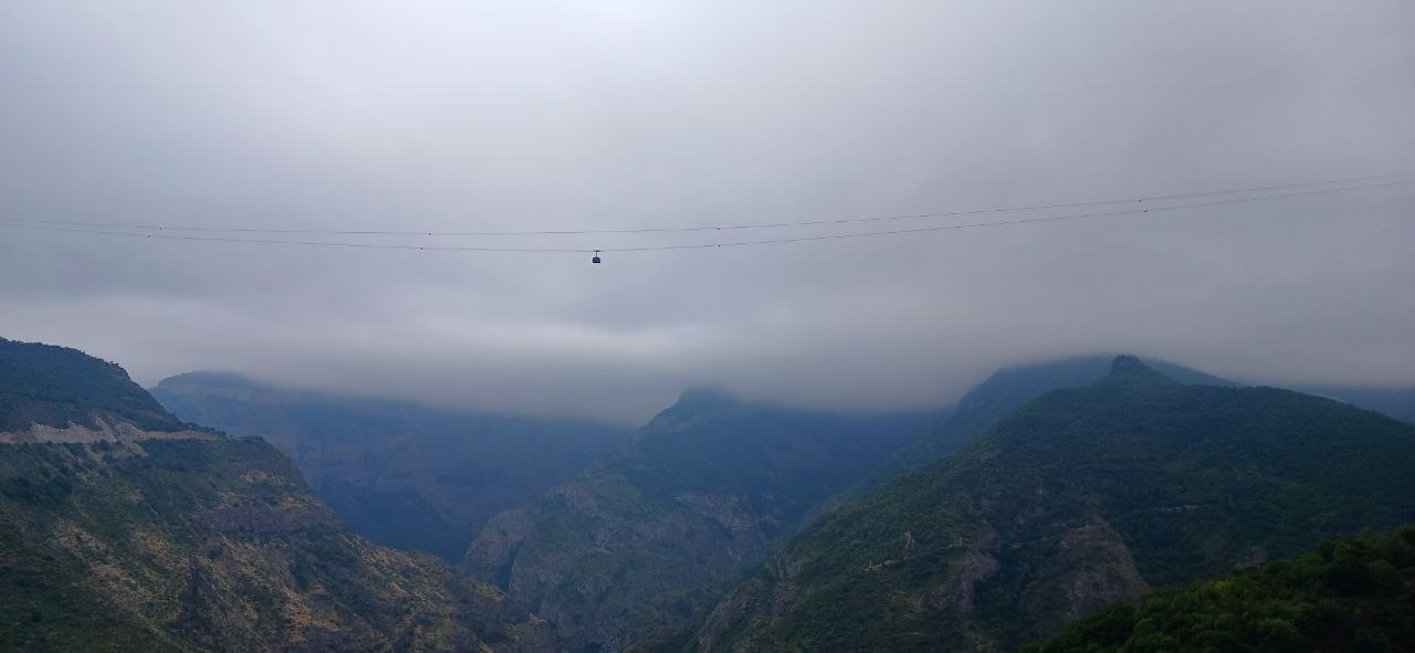 Там есть канатная дорога через ущелье, но в тумане были высоки шансы вообще ничего не увидеть. Так что наша компания разделилась: половина всё-таки поехала по канатной дороге, а я со Светой Таскаевой - по серпантину на машине.