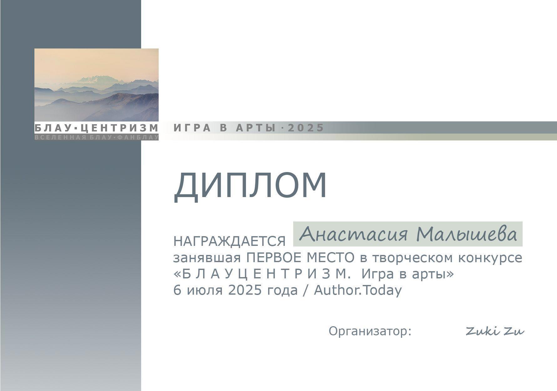 По сложившейся традиции, напомним Правила Игры в части подсчета голосов при голосовании: Выбор Читателей Выбор Организаторов Выбирается из всех работ, не ставших победителями Игры. 2. Анастасия Рейнгард (37 + 9 = 46 баллов) 3. Елизавета Филиппова (23 + 9 = 32 балла) 4. Alex Rubin (16 + 9 = 25 баллов) 5. Konstant-a (12 + 9 = 21 балл) 6. Safina (8 + 12 = 20 баллов) 7. Анастасия Малышева (9 + 9 = 18 баллов) 8. Иван Колганов (9 + 6 = 15 баллов) ________________ * ВСЕ РЕЗУЛЬТАТЫ подсчета голосов будут внесены на страницу новостей, а также на страницы всех Работ Участников не позднее 00:00 мск 10 июля 2025 года. ПОБЕДИТЕЛИ творческого конкурса награждаются: ОСТАЛЬНЫЕ УЧАСТНИКИ творческого конкурса получают:ПО РЕЗУЛЬТАТАМ ГОЛОСОВАНИЯ ЧИТАТЕЛЕЙ,