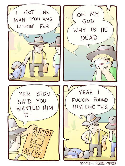 * Стандартная форма подобных объявлений — wanted dead or alive, т. е. «Разыскивается живым или мертвым», на картинке на объяве созвучное Wanted DAD Alive — «Разыскивается ОТЕЦ живым»