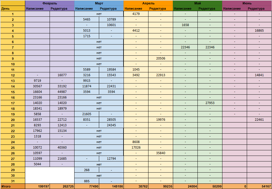 Вот моя статистика с самого начала ведения трекера. По ней можно чётко отследить, когда вдохновение так и лилось, а когда... не слишком. Да, перерыв получился приличный. Но иначе и быть не могло: в моей жизни происходили достаточно тяжёлые события, о которых я писать не хочу. Поэтому писательство ушло на задний план. Но в июле я планирую это недоразумение исправить.