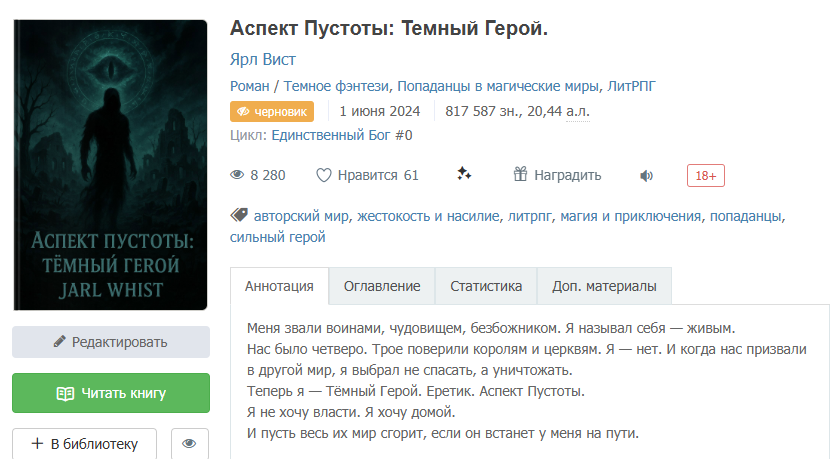 P.S А еще инфа, забыл сразу уточнить), следующая книга что притерпит некоторые изменения будет "Кровавый Эльф" и следом сразу же "Мир Абруамэлу" (Некоторые могут знать его по названию Magishe Erotik) и уже после я начну редактировать и продолжать писать последнюю свою книгу, где Михаил (он же темный герой) стал богом и разрушил Землю впустив туда систему, где главный герой уже другой.