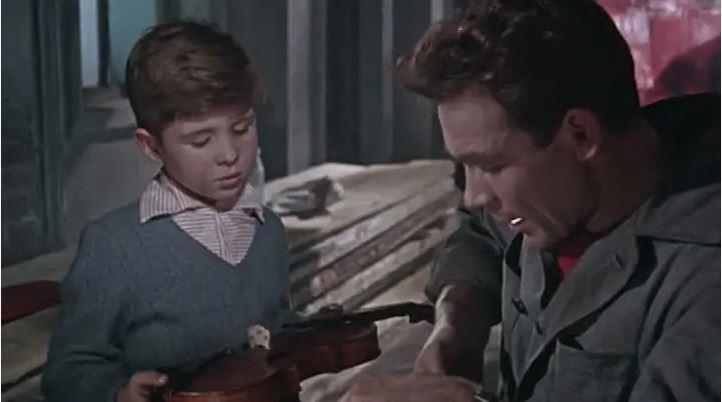 В ответ мальчик угадывает свою оплошность, и под высокими гулкими сводами ворот «музыкант» достаёт из футляра свою скрипку и объясняет новому другу то немногое, что он успел узнать в школе, а потом играет для него. Молодой рабочий в шоке, он и не думал, что ребенок может так изумительно играть. Он с уважением рассматривает скрипку с замысловатым рисунком эф и, притихнув, слушает игру своего нового друга. И «трудяга», гордящийся мозолями на руках, теперь с пониманием смотрит и на мозоль, натертую скрипкой на подбородке маленького «музыканта». В свою очередь «музыкант» понял смысл труда и цену хлеба. Оба осознали в эти мгновения великий труд и великую силу искусства.