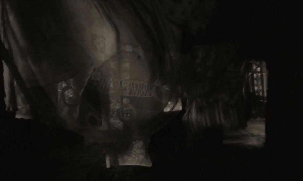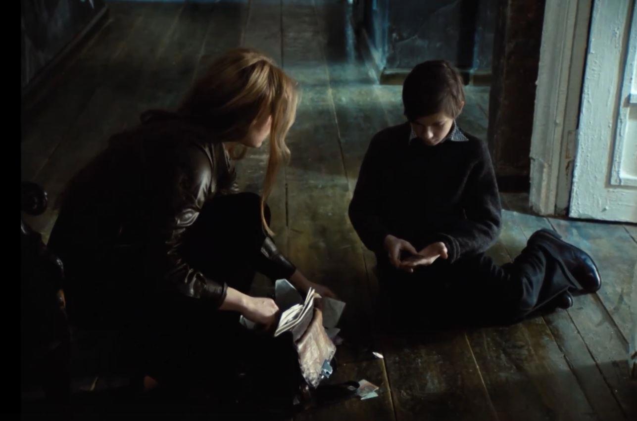 2. Сцена где мальчик сначала играет на полу, а затем видит в ее комнате странную пожилую женщину за столом с бокалом. Женщина заставляет мальчика взять со стеллажей книгу и читать ее.