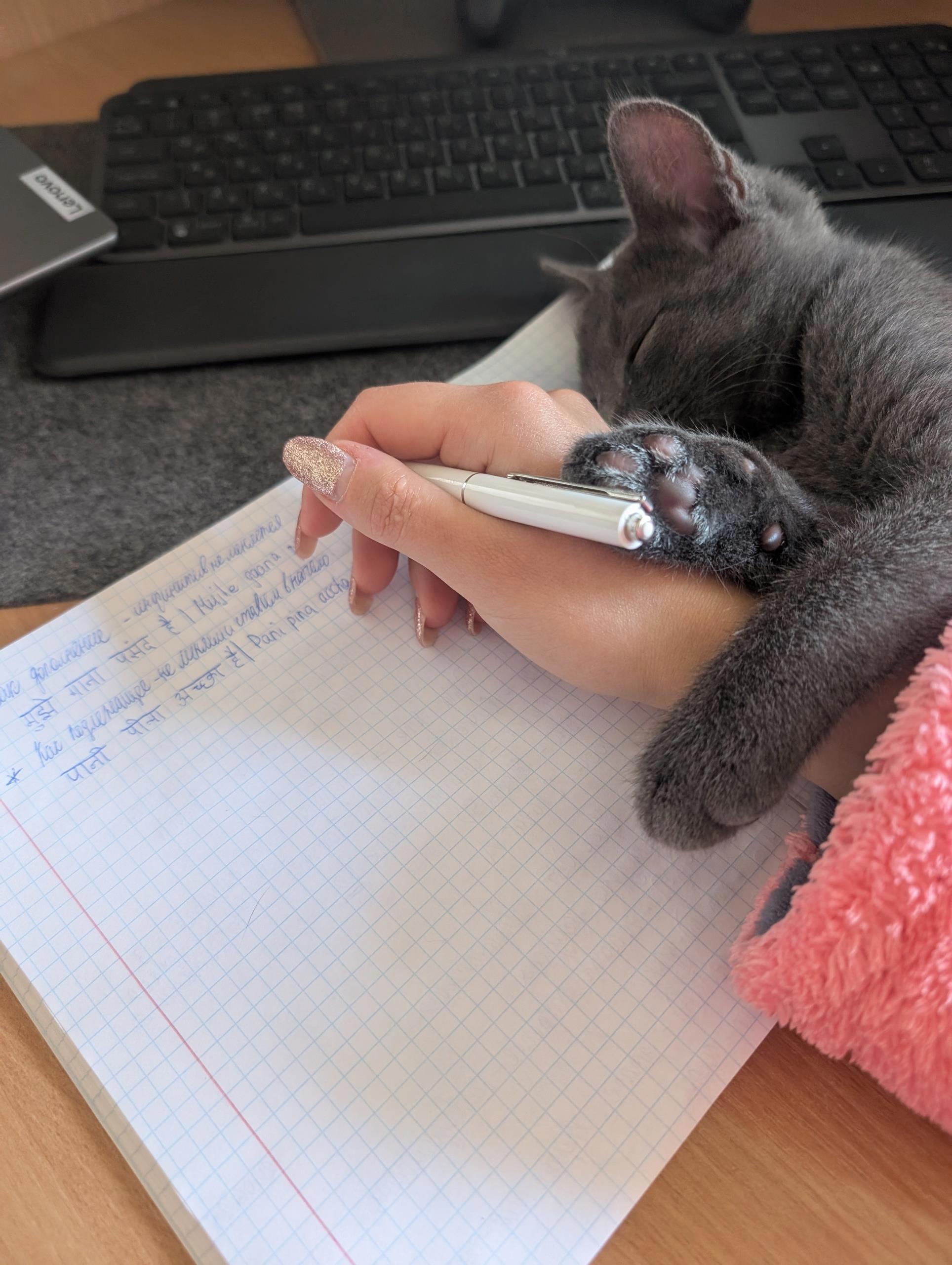 Автор: Алена ЛотосОказывается я ничего не писала о своих занятиях хинди, вам же это очень интересно, правда? аж с 4 сентября! Но я их не забросила, нет, просто красивой фотки как-то не получалось сделать... А тут, сидим сегодня, обсуждаем роль инфинитивов, а тут мой трех-с-половиной-месячный котенок устал играть моими фиалками и гонять комаров над ледебуриями - и решил присоединиться к изучению