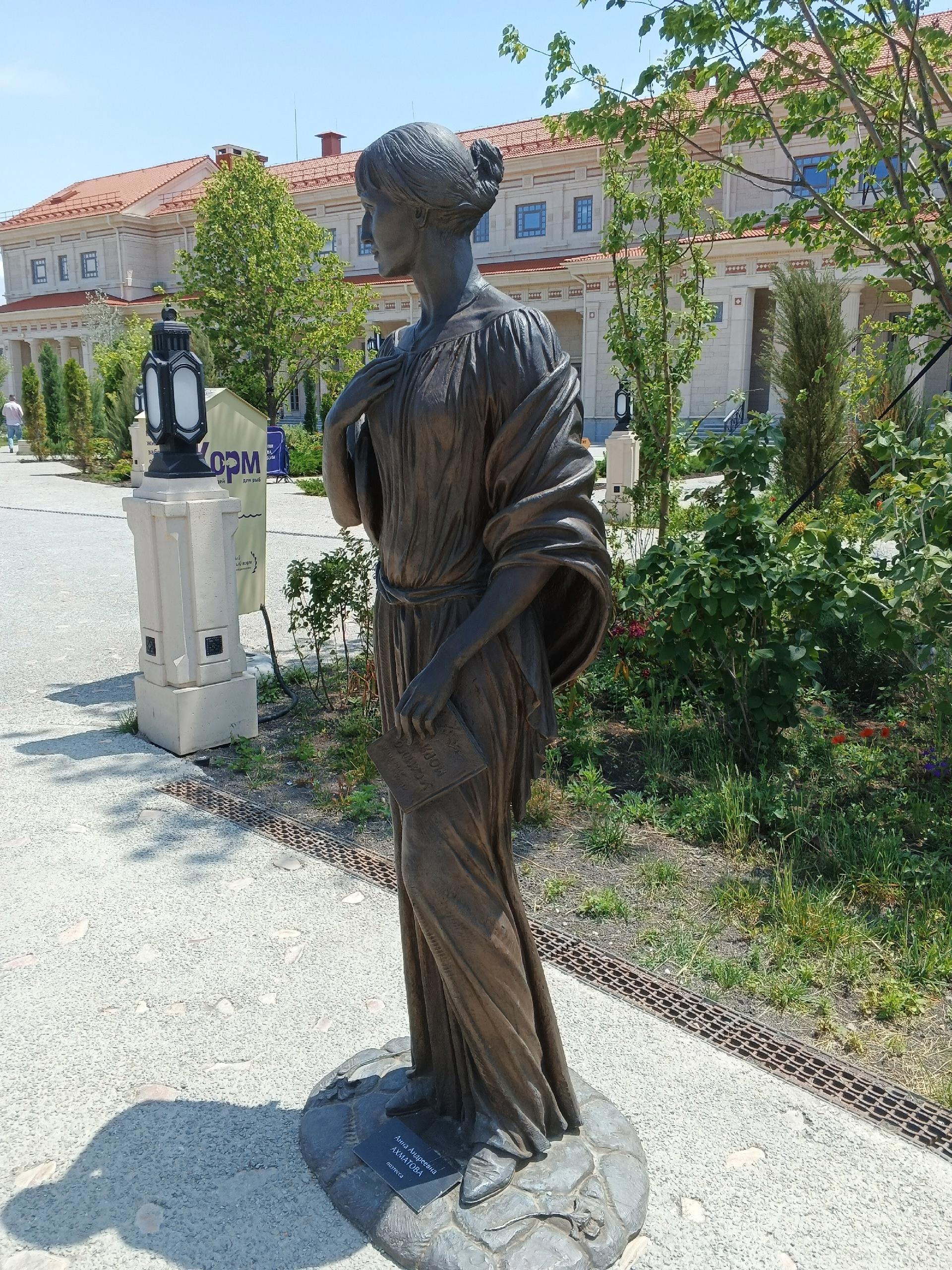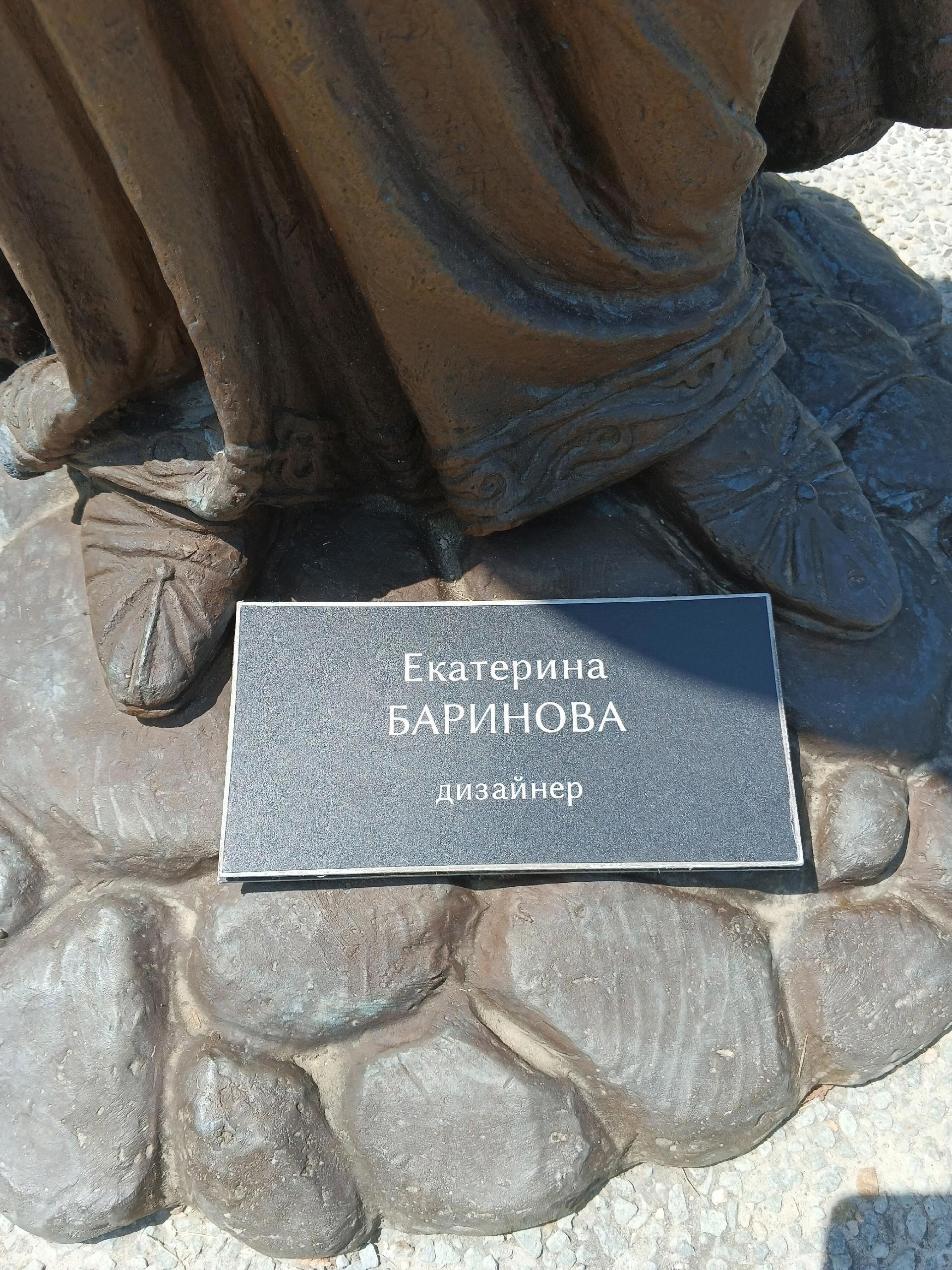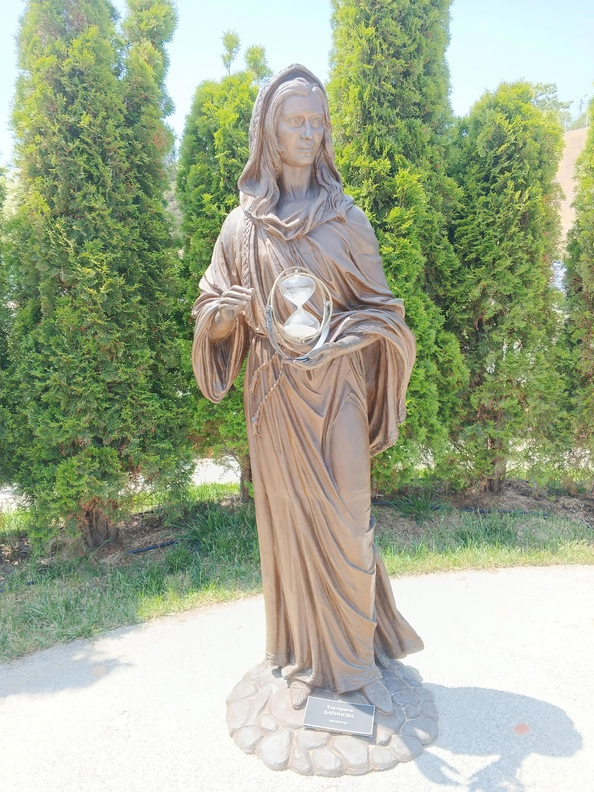 Ну и последней я хочу напомнить вам о женщине, которая проектировала именно этот парк, которая разрабатывала дизайн клумб, дорожек, мест отдыха. О ландшафтном дизайнере Е. Бариновой, которая погибла в дорожной аварии за несколько дней до открытия Нового Херсонеса. И в центре парка стоит памятник этой хрупко, но такой талантливой женщине, подарившей нам эту красоту. В её руках песочные часы, как символ быстротечного времени.