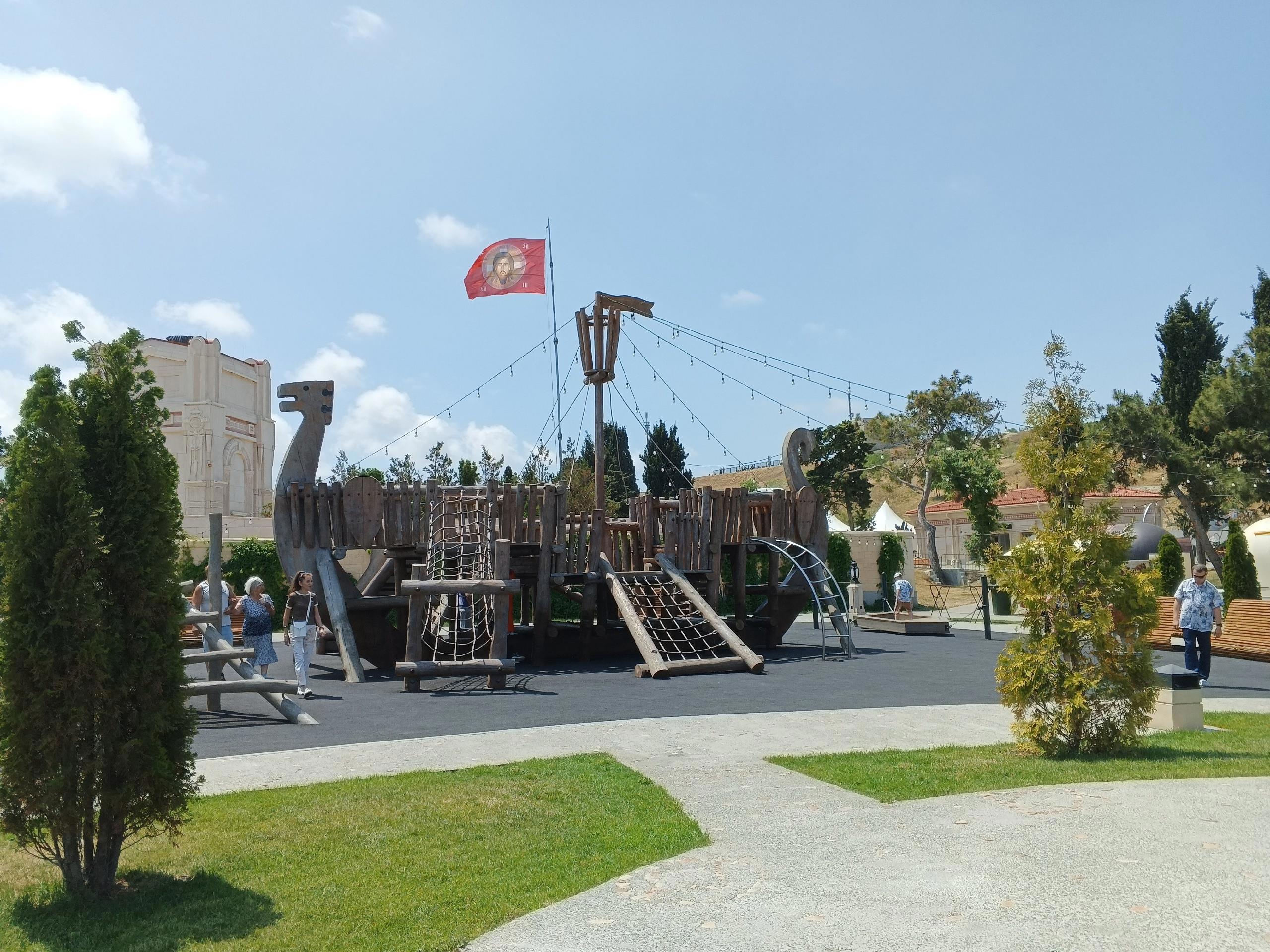 Рядом с макетом располагается большая площадка для детей, оформленная в виде стилизованного слияния двух самых известных видов кораблей: драккара (символ пути из Варяг в Греки) и русской ладьи (иногда говорят - лодья).