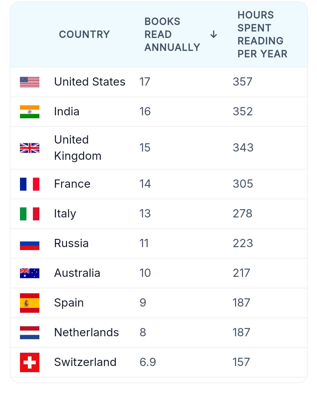 На других сайтах американцам дают книг меньше. Но вот что индусы на первом-втором месте в мире по чтению - в этом не сомневается никто. Причем высокий показатель у индусов держится давно, лет десять минимум.