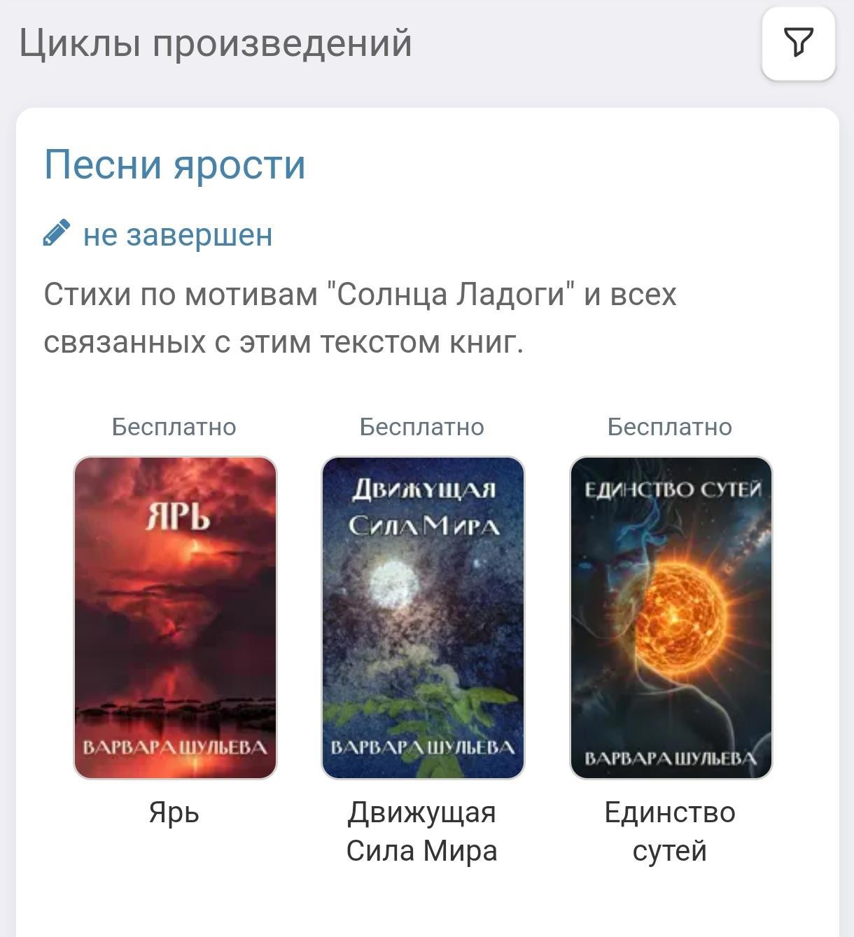 В конце прошлой недели опубликовала новый сборник "Единство сутей", это о путях духа, одного духа, духа в чистом виде. У него было много имён и несколько сутей, но все эти сути едины, а путь его, пути его духа, были длинными и тернистыми, а иной раз и радостными. В этих стихах есть сила мира, космоса, есть природа, могущество духа и необъятная сила любви. Если вам это не чуждо, тогда вы поймёте.