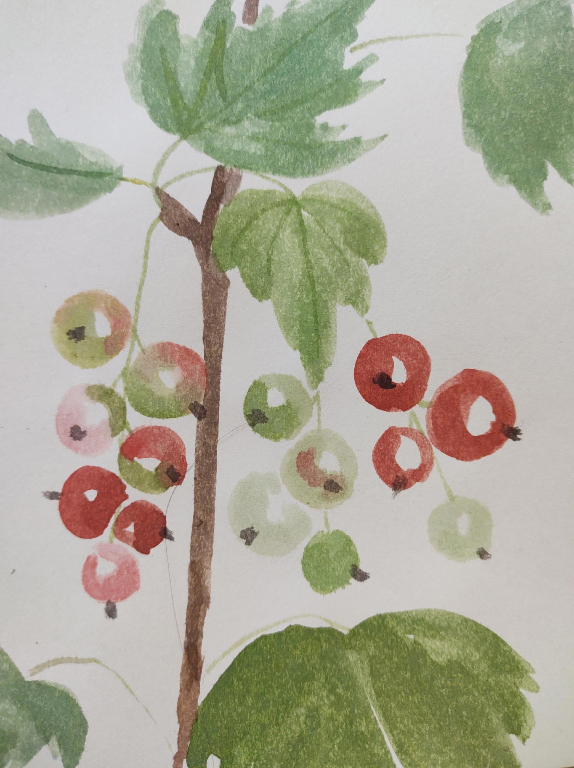 Автор: AneilyКрасная смородина просто сразу кисточкой и акварелью. Внезапно акварель чуть ли не просачивается на другую сторону листов этого скетчбука. Хотя казалось бы...