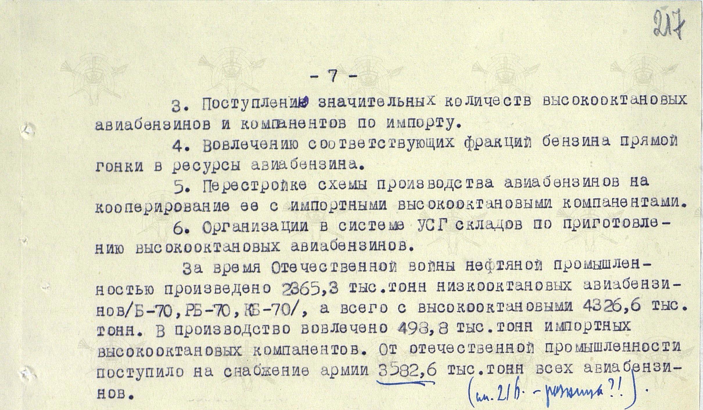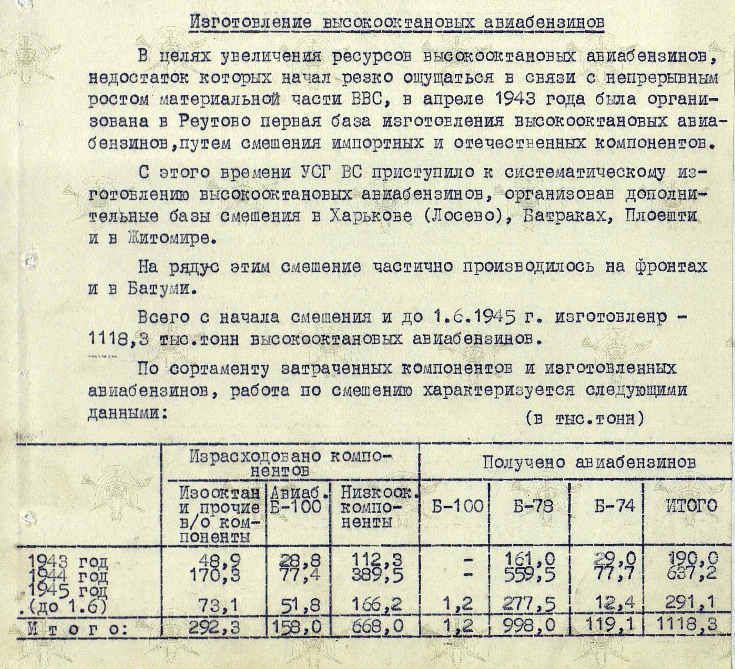 Да и с двойным учётом импортных поставок тоже как-то не выходит. Во-всяком случае, Служба снабжения ГСМ отдельно учитывала импорт, отдельно отечественный авиабензин, отдельно - полученный с баз смешения. И не просто учитывала, но и прямо об этом писала в докладах.