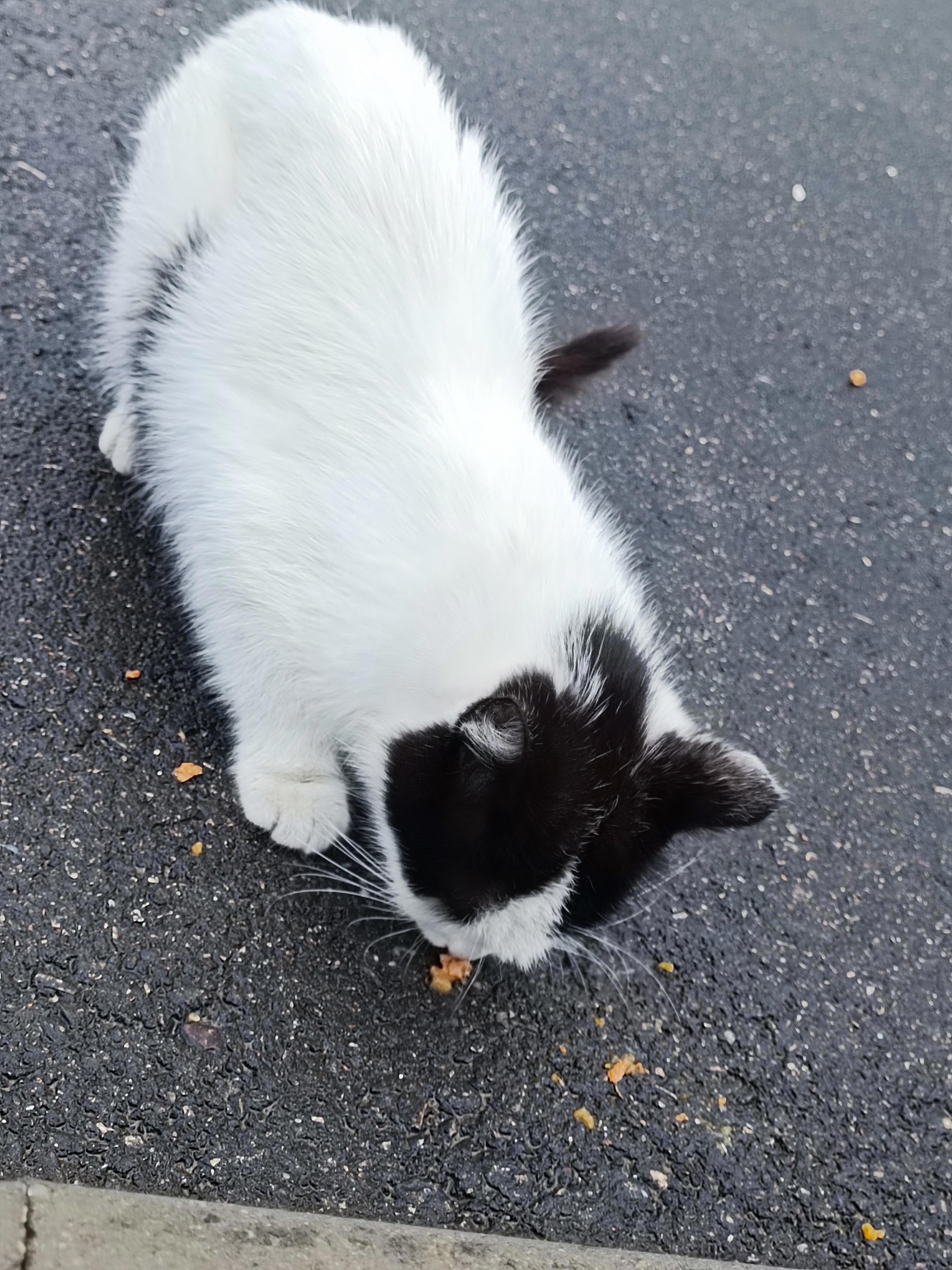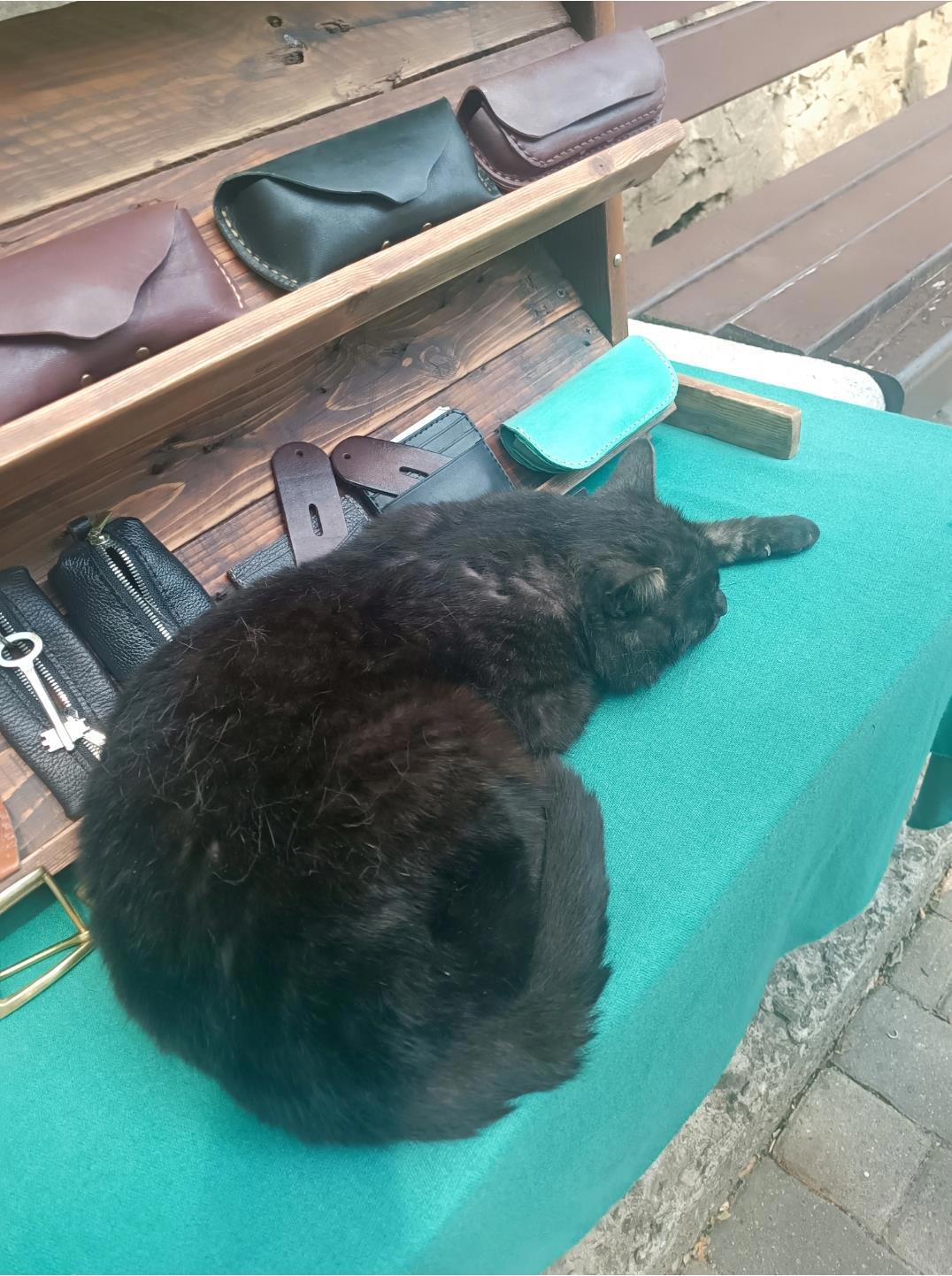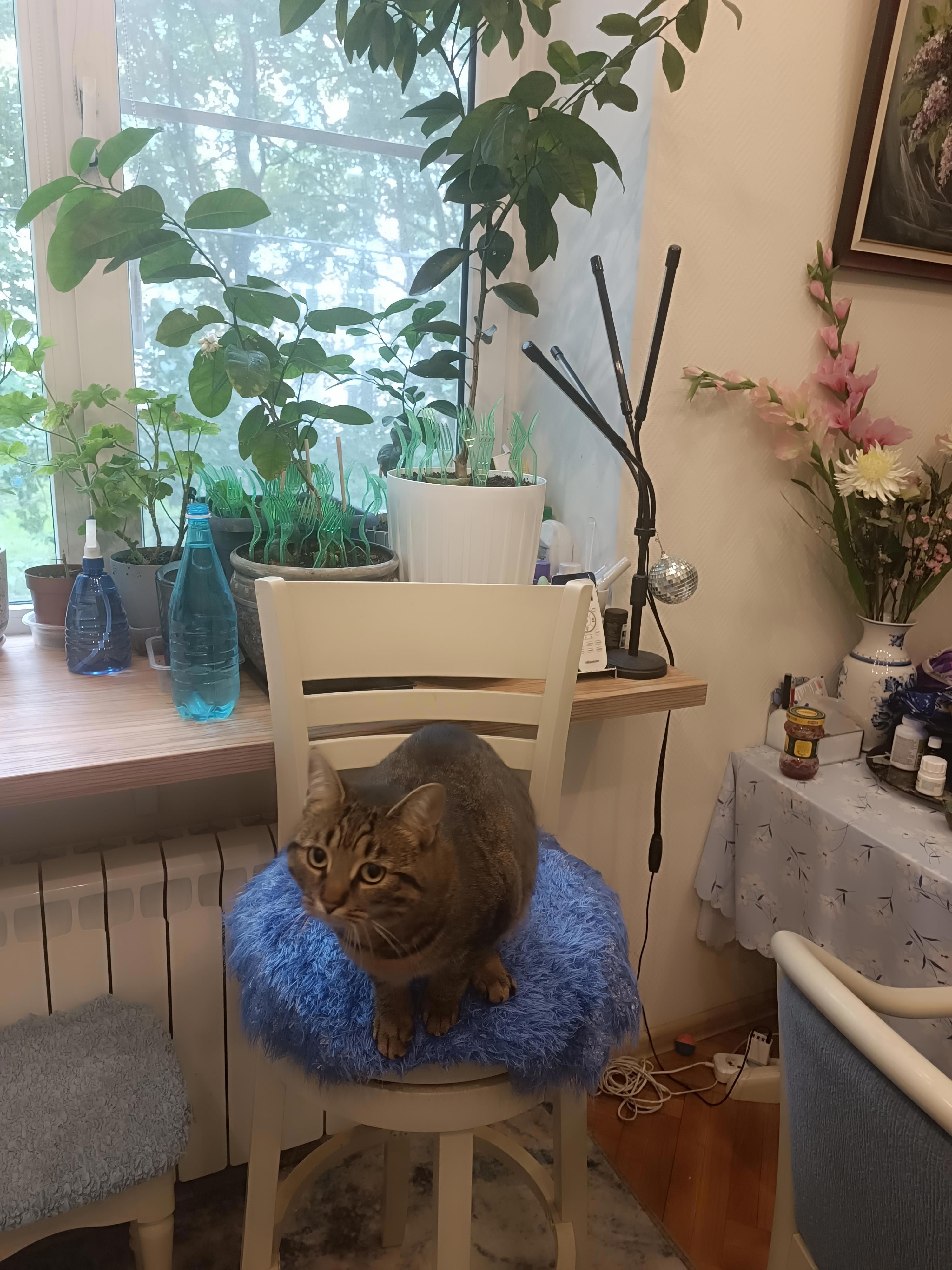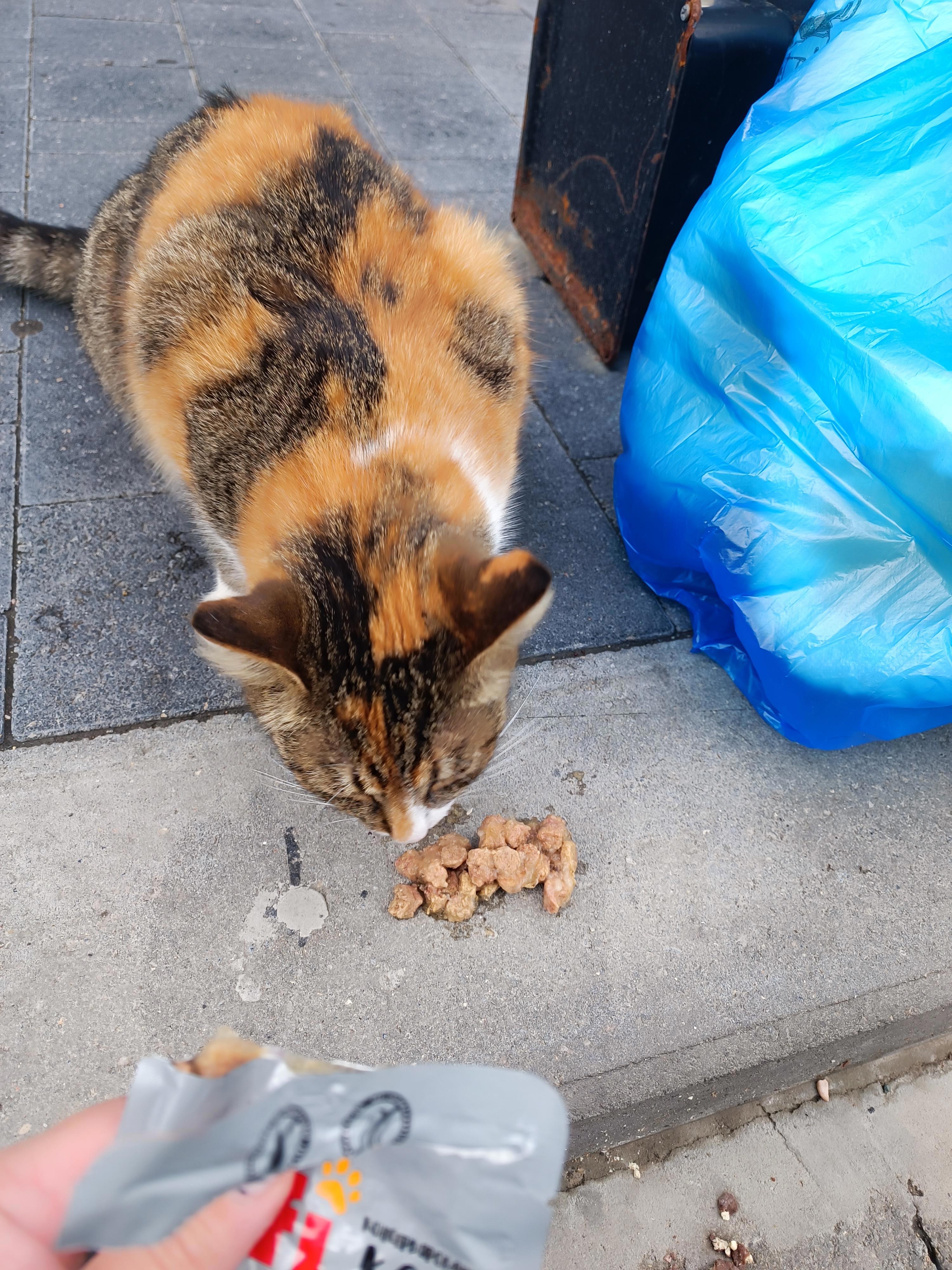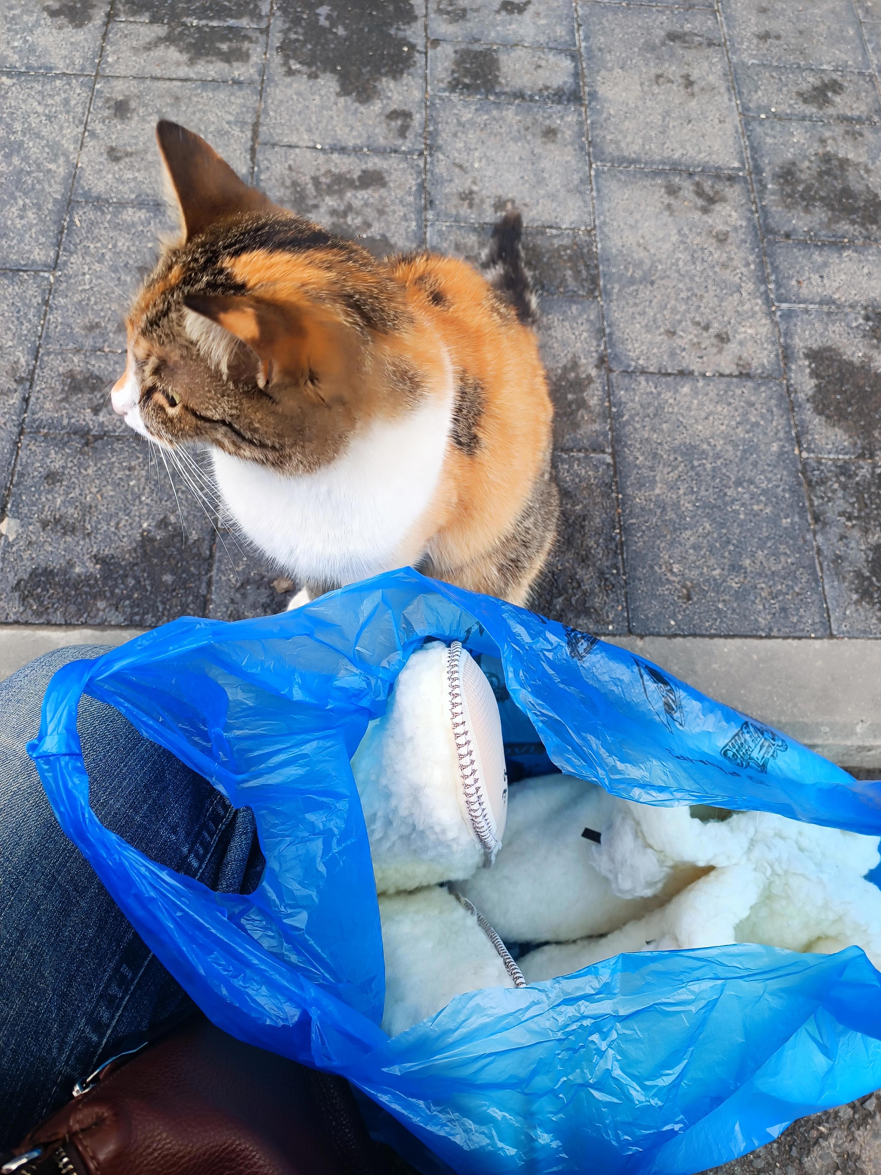 Очень деловая кыса из Пятигорска, я ей говорю — посторожи-ка тапульки, это для бабушки. Она очень ответственно сторожила, пока я доставала пакетик с кормом. Потому что у каждого уважающего себя любителя косек должна быть с собой еда для тех, кто может посторожить тапульки.