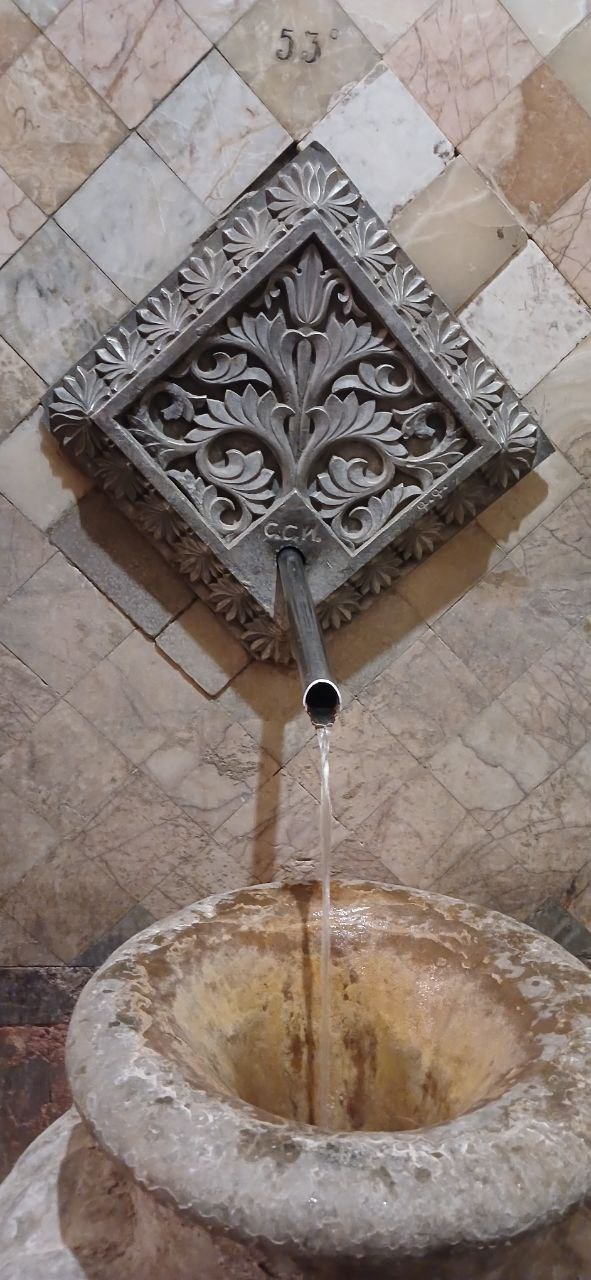Вода с большим содержанием железа, так что на всём рыжий ржавый налёт. Источники горячие, температура растёт с левого конца галереи к правому и доходит градусов до 50-ти.