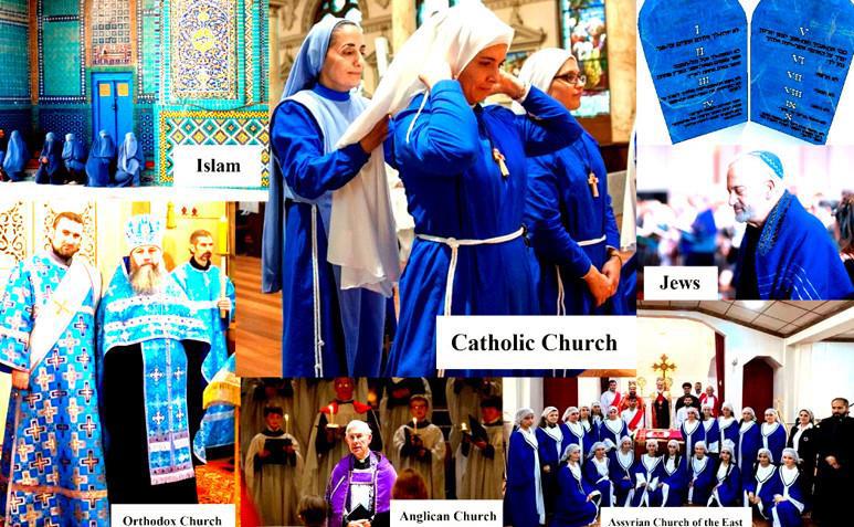 Восточная Православная Церковь, Англиканская Церковь, Святая Апостольская Католическая Ассирийская Церковь Востока, Католическая Церковь, Израильский Раввинат, Ислам чтят Скрижали Завета и носят синие одежды в большие праздники, посвященные исполнению законов Божиих, данных Моисею на синих каменных скрижалях. Смотрите иллюстрацию.