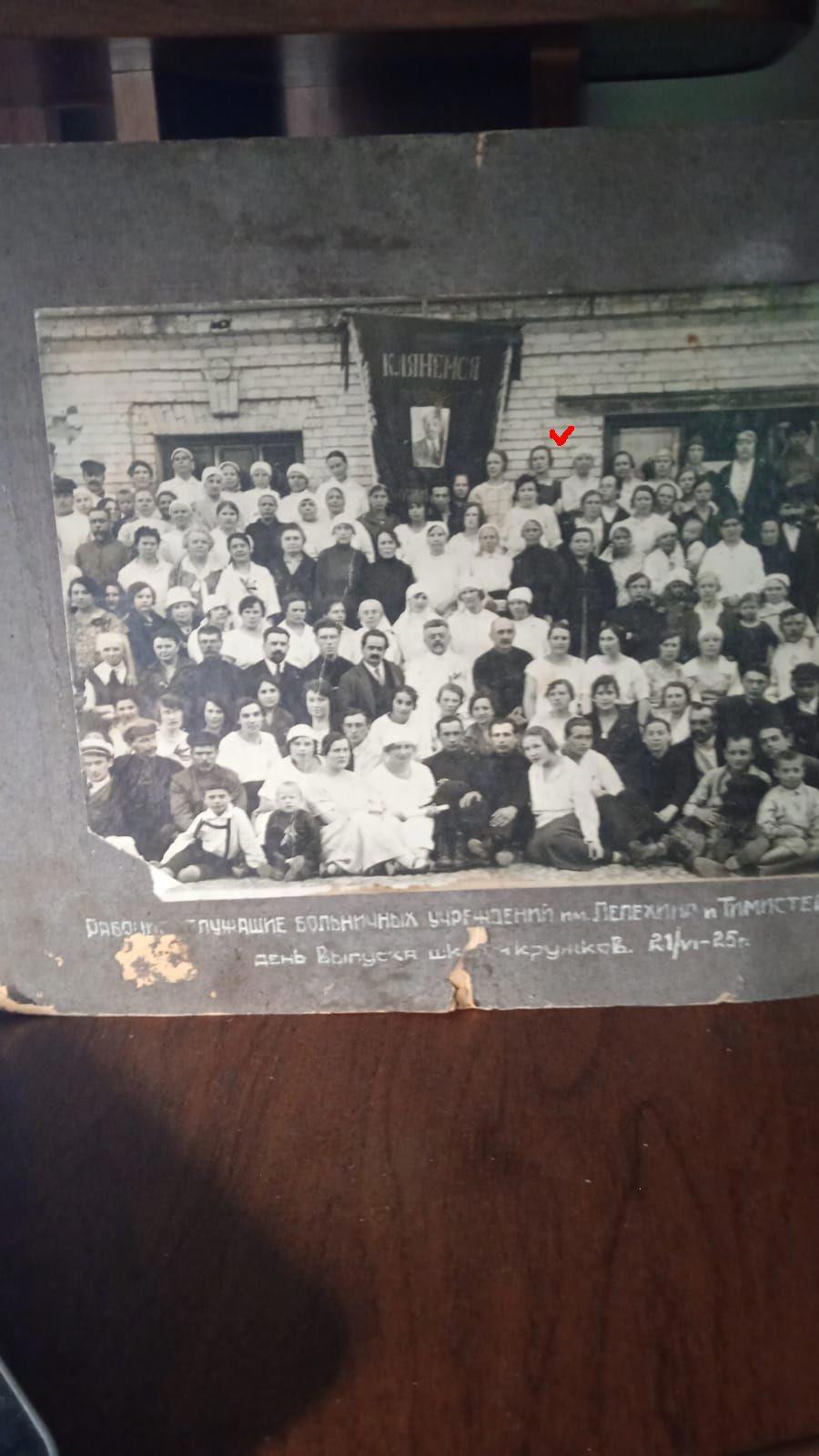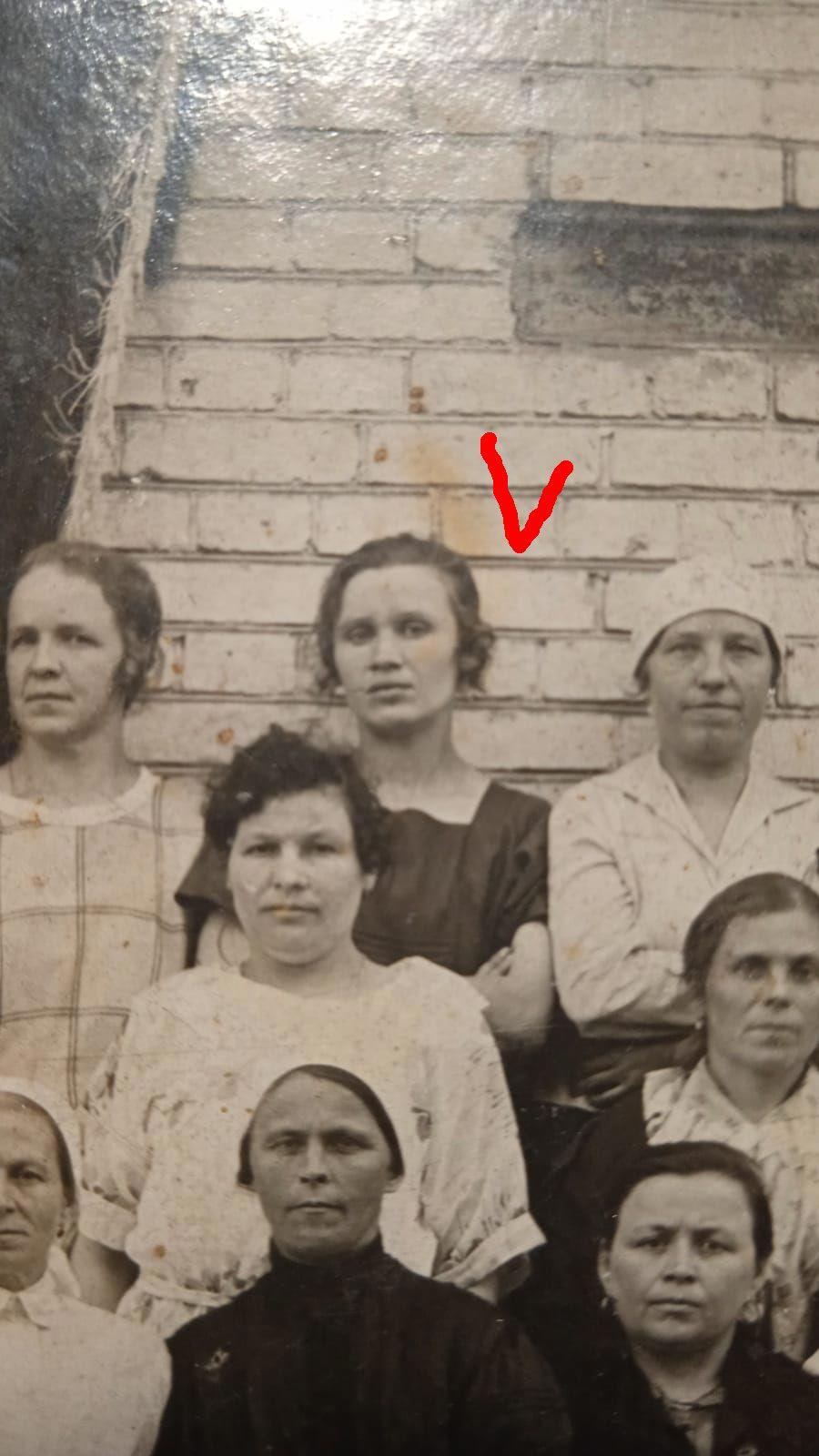 В верхнем ряду недалеко от стяга стоит моя бабка по матери. Ей 21 год, и выглядит она по сравнению с окружающими её тётями рабоче-крестьянской принцессой. Хоть и работает санитаркой.