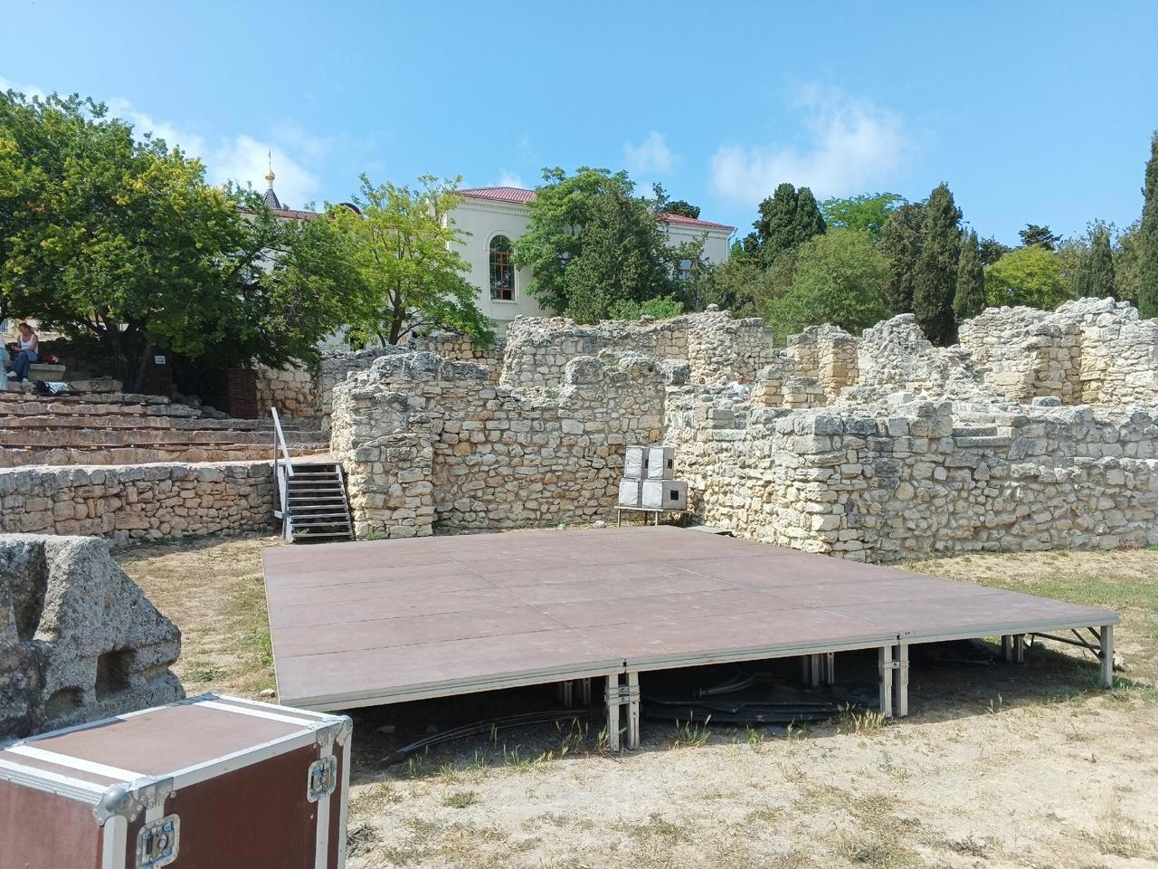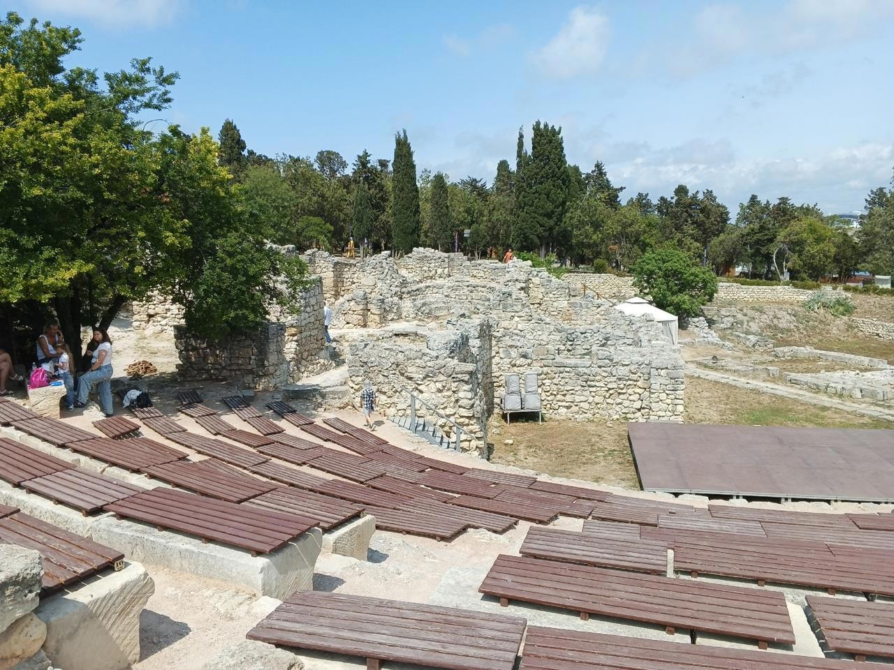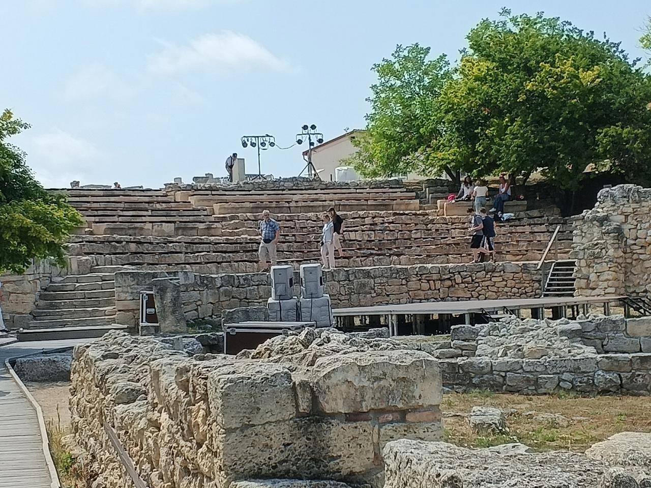 Из зрительного зала открывается вид на центральную часть театра и бухту за ним. Сейчас здесь установлена сцена и усилители звука. В Херсонесе проходят регулярные театральные постановки, музыкальные вечера, выступления певцов и концерты.