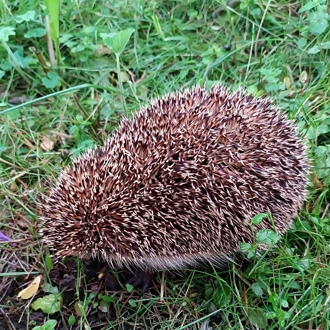 Для обложки надо было сделать эту фотку (а для этого улучить момент, когда дождь подустал и пошёл набираться новых сил). Мне была нужна просто фотка нашей улицы (да, это улица, заросшая травой по колено — дальше в ту сторону никто не ездит, и косить тоже никто не хочет). Там упомянутый в рассказе коричневый забор. А вяхири (это такие голуби-переростки) на мокрых проводах сидеть на хотели. Ёжик тоже мокнуть не хотел, но они реально бегают, вот доказательство: