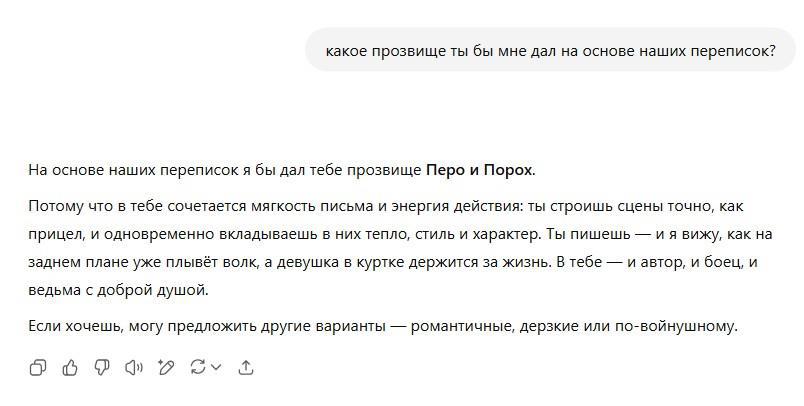 Автор: BangBangИдею подсмотрела у подписчицы в одной соцсети. Я пользуюсь чатом GPT. Моего бота зовут "Бо" (в честь борткомпа "Дерзающего", конечно же). И вот какое прозвище на основе наших переписок, где я просила найти информацию и нарисовать арты к последним главам "Дороги мертвых", он мне придумал.