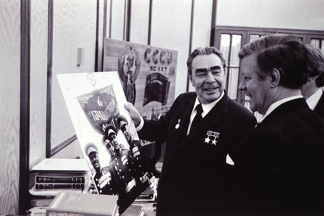 Л.И. Брежнев показывает канцлеру ФРГ Вилли Брандту своё фото на Параде Победы 24 июня 1945 года