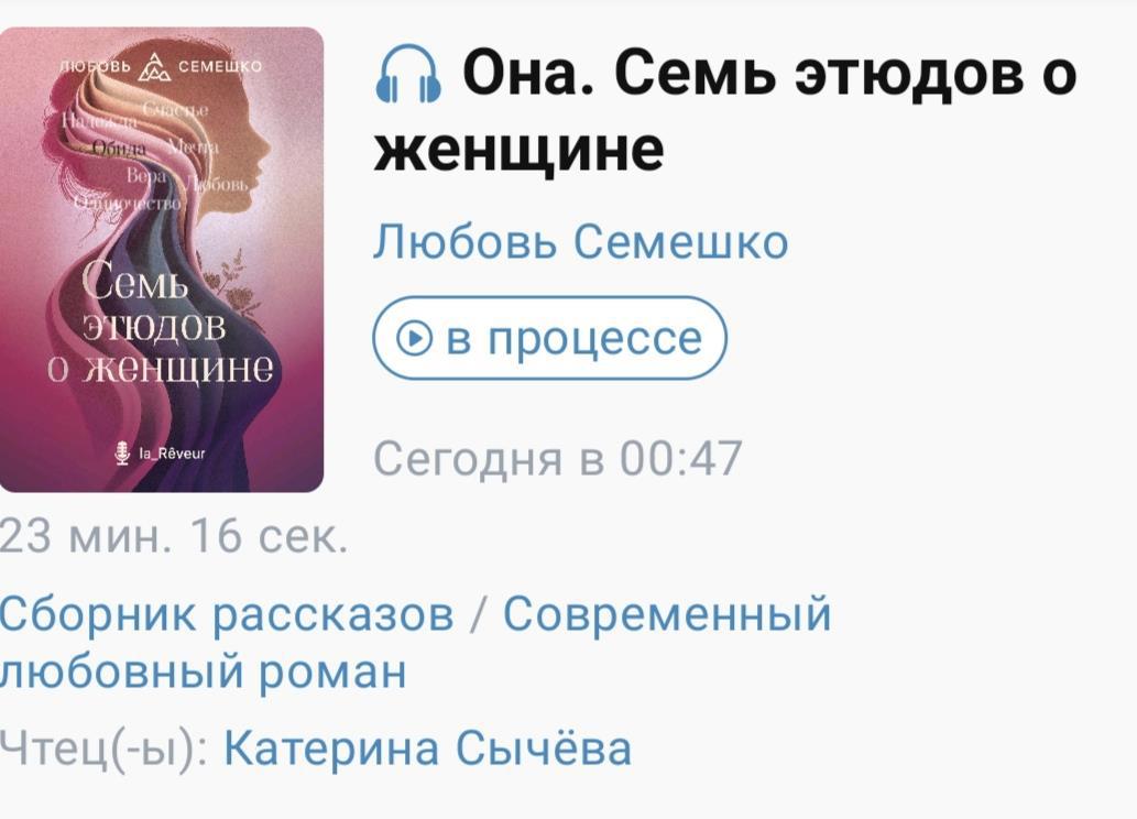 Автор: Любовь Семешковолшебным голосом Кати Сычёвой. Каждая история о женщине обрела своё звучание.