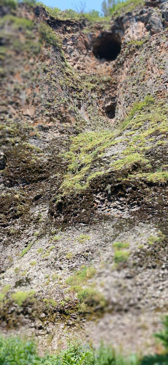 В скалах пещеры.