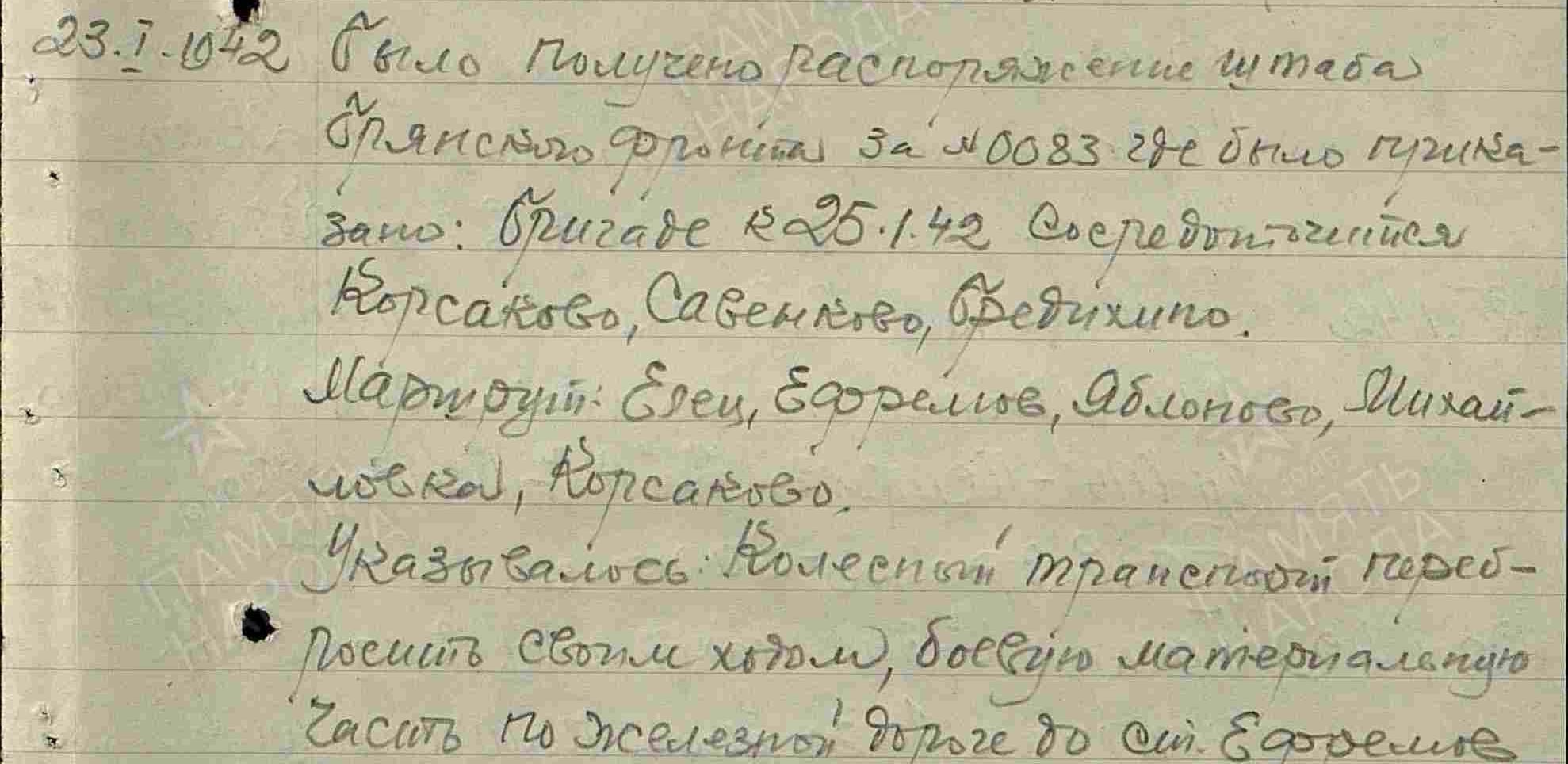 Для тех, кто рукописный шрифт разбирает плохо: 23 января штаб фронта отдал бригаде боевое распоряжение (№0083): к утру 25 января сосредоточиться в районе села Корсаково и близлежащих деревень Савенково и Бредихино. Колесный транспорт должен был переходить своим ходом, а танки и тракторы – по железной дороге до Ефремова и далее – также своим ходом.