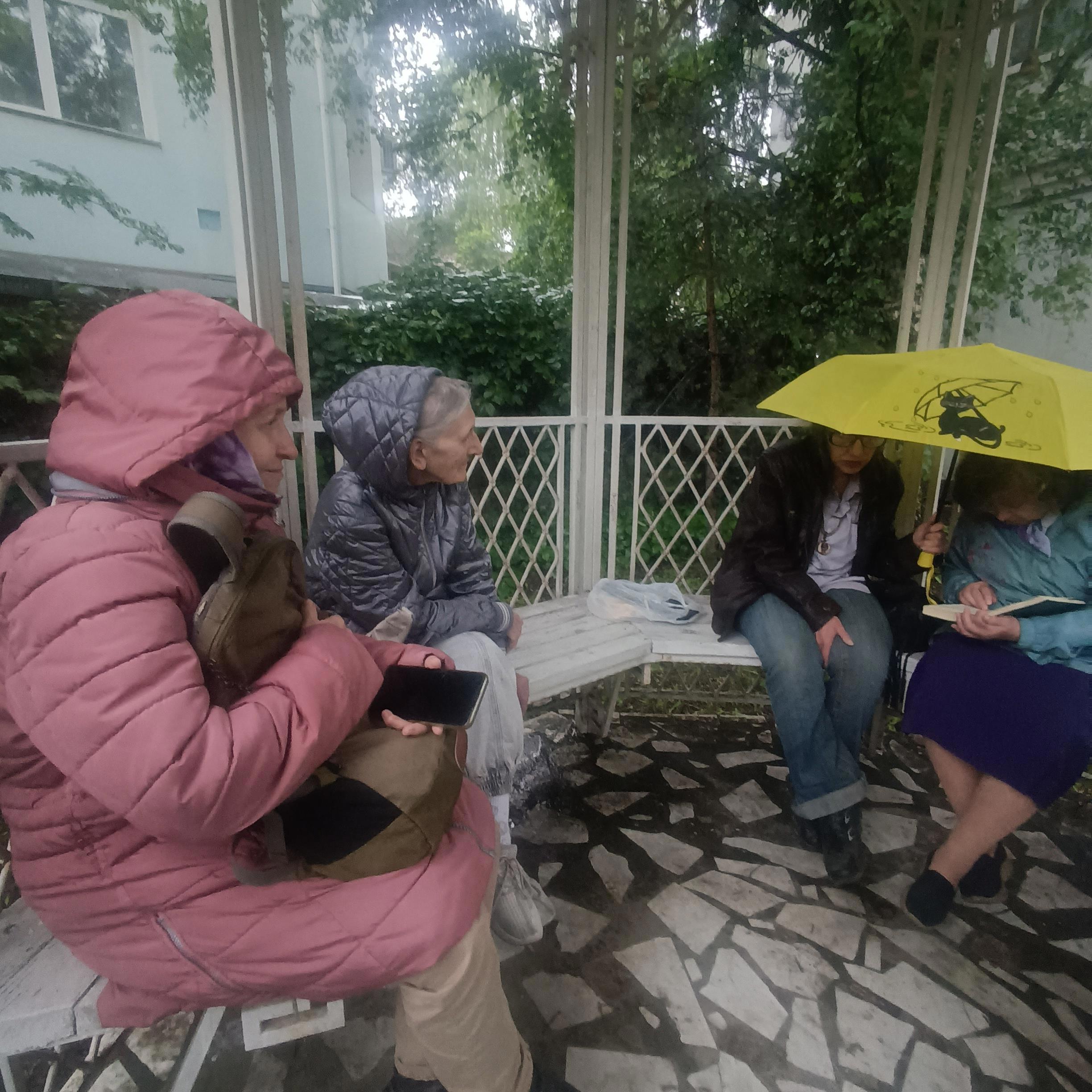 Зонт держу я, поэтому сижу к Ирине Хоновне так близко, что буквально телом ощущаю все интонации и эмоции. Иногда она прерывается, говорит несколько слов от себя. Иногда возникает диалог между участниками, желающими поделиться впечатлениями или ассоциациями. Она смотрит пристально. В её глазах столько света и жизни, и радости, и даже немножко озорства. Люблю смотреть в её глаза!