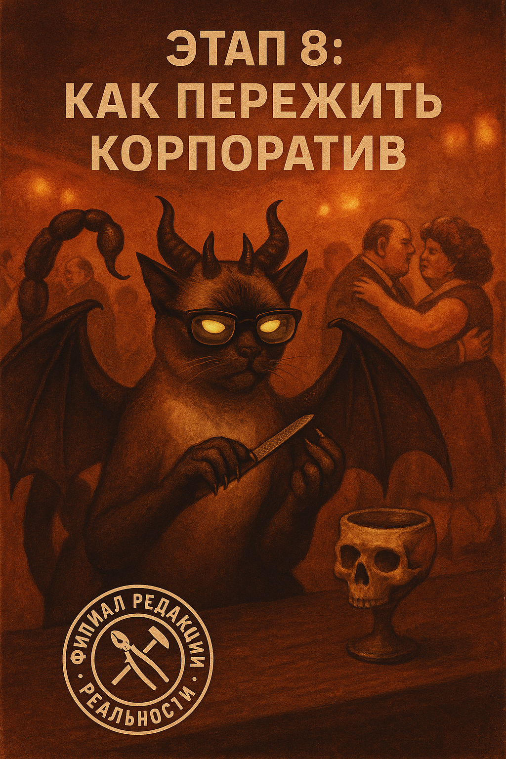 Этап 8: Как пережить корпоративТвоя задача остаться при памяти не испортив репутацию. Это не просто событие. Это ритуал социальной агрессии замаскированный под дружескую вечеринку на несколько тыщ душ. Это вечер, когда офис сбрасывает маски, чтобы надеть более идиотские. Подготовка: Сначала пойми: это не праздник, это поле боя в глиттере. Всё это — дешевизна, маскирующая пустоту. Праздник вроде внешне выглядит весело и ярко, но внутри — бессмысленно, неловко и даже порой постыдно. Честнее было лицезреть пир во время чумы. Ты идёшь туда не веселиться, а выполнять миссию маскировки под «человека, которому не всё равно». Перед выходом выбирай наряд по формуле:+5 к вежливости, –3 к самооценке, не более +1 к сексуальной тревожности на квадратный метр ткани. Никаких крыльев, хвост прячем в штанину, ну и что что это странно выглядит, можешь типа в шутку сказать что снимался в порно но тебе надоело. Потренируйся перед зеркалом и запомни какое должно быть выражение лица — «я здесь по доброй воле». Когти спрячь под перчатки. Если когти никак не прячутся — забабахай маникюр. Да, серьёзно. Говорят, это сейчас модно. Например все итальянские мафиози стабильно делают маникюр. Да, ты — древнее существо, но корпоратив требует жертв или хотя бы гель-лака. А если кто-то рядом начинает коситься, интересоваться или (что хуже всего) отпускать шутки, просто смотри сквозь него, как сквозь стекло, и монотонно процитируй, подтачивая мизинец напильником: «Быть можно дельным человеком и думать о красе ногтей (с)». Если добавить к этому лёгкое мерцание зрачков в жёлтом спектре и ауру хаоса, сотканную из предвечного огня и мелкой бытовой ярости, эффект будет гарантирован и от тебя отстанут. Не волнуйся, на следующий день никто ничего не вспомнит ибо коллективная амнезия после корпоратива — это первая заповедь корпоративного бога забвения. Всё, что было в Вегасе, остается в Вегасе или всё, что было на корпоративе, остаётся в тумане коллективного отрицания. Пока все ещё трезвые и изображают благородных существ, самое время совершить несколько стратегических подношений в виде комплиментов. Главное — направь их не в сторону альф и альфёрок, а в сторону слегка забытых, небрендированных созданий. Ну тем, кому обычно достаётся роль фона в Zoom. Они это запомнят. А через три бокала — будут тебя защищать. +5 к карме, +10 к социальному прикрытию. Алкоголь, который тебе будут подсовывать под видом вина, элитного виски или чего-то с маракуйей — не предназначен для живых организмов. Не пей. Слей в урну в курилке. Там же, в укромном углу, можешь тихо потягивать свой настоящий напиток: коктейль на основе нектара, амброзии и капельки сомы, спиженной у Куберы, — не волнуйся, у него этих запасов, как у HR департамента обидных мотивационных постеров. Но помни, сома не бесконечна, и когда будет следующая оказия подрезать божественную субстанцию у богов— только боги знают, или не знают)) Во время: Главное — двигаться как дым: быть везде и нигде. Появляться рядом с начальством на 3 минуты (не дольше), кивать, говорить фразы вроде: — «Отлично всё организовано, спасибо команде!» (перевод: я всё помню, но притворяюсь благодарным). Избегай открытых микрофонов, караоке и любого разговора с фразой: — «А давай по-честному».