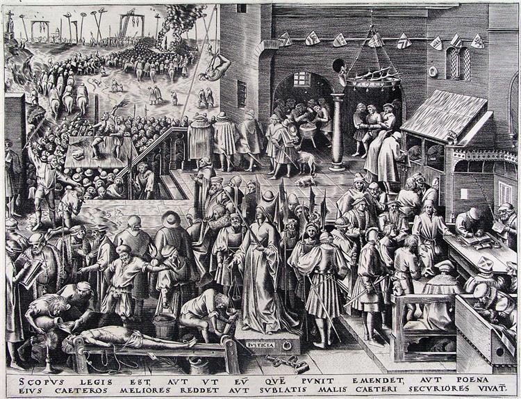 На гравюре Питера Брейгеля Старшего "Правосудие" (оригинальное название: Iustitia) изображена практически вся (условно) средневековая система наказаний за разнообразные преступления.