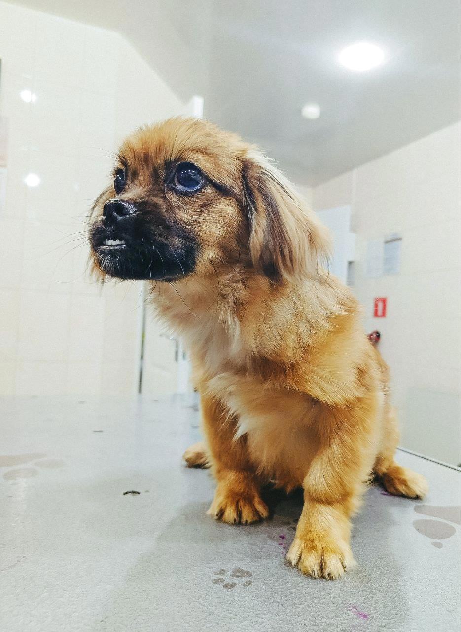 Пёсель-бродяжка (помесь пекинеса и дворняги), которого подобрали в двух домах от поликлиники и мгновенно решили, что "заберут в семью", тут же притащив к нам на осмотр.
