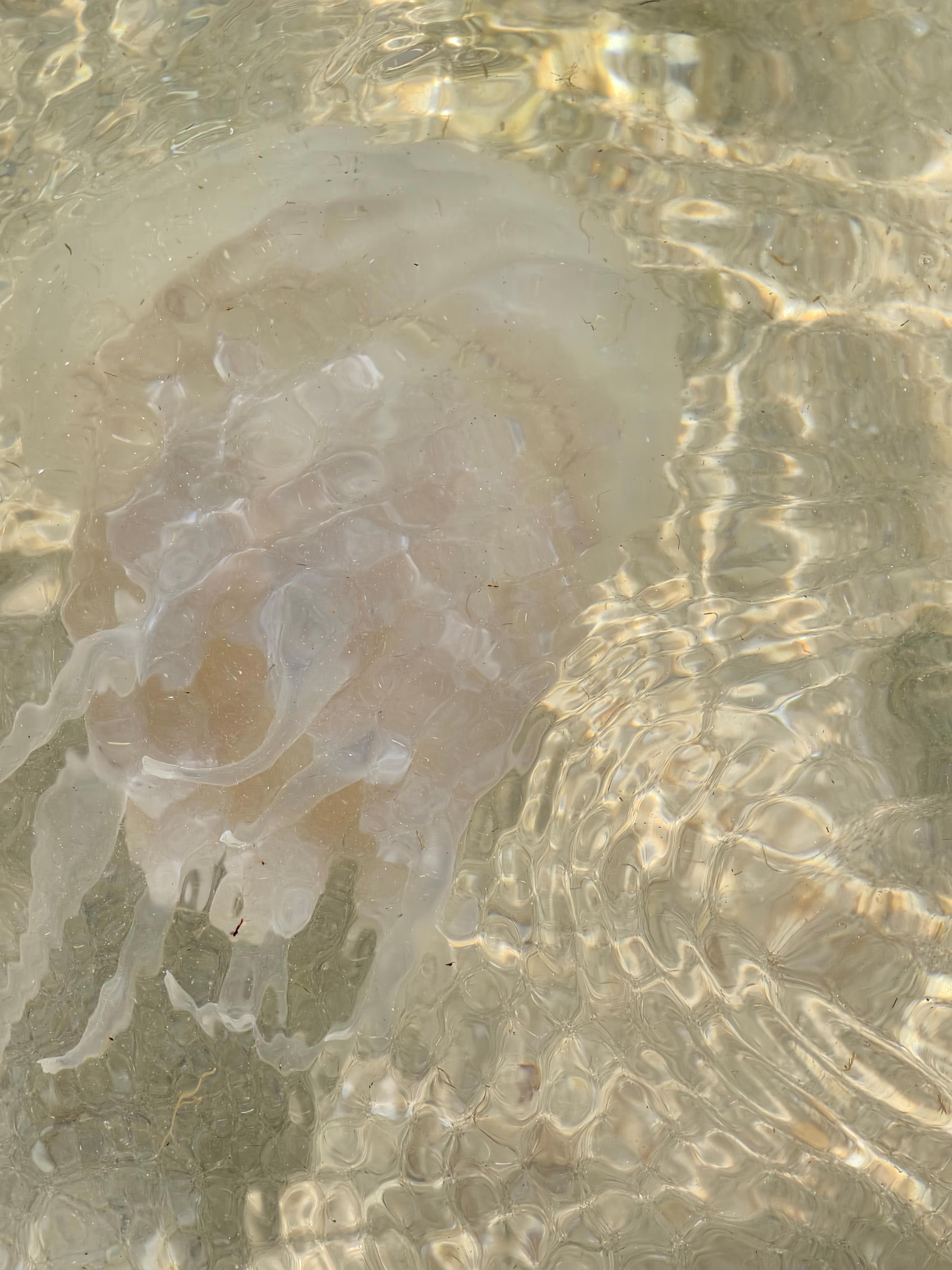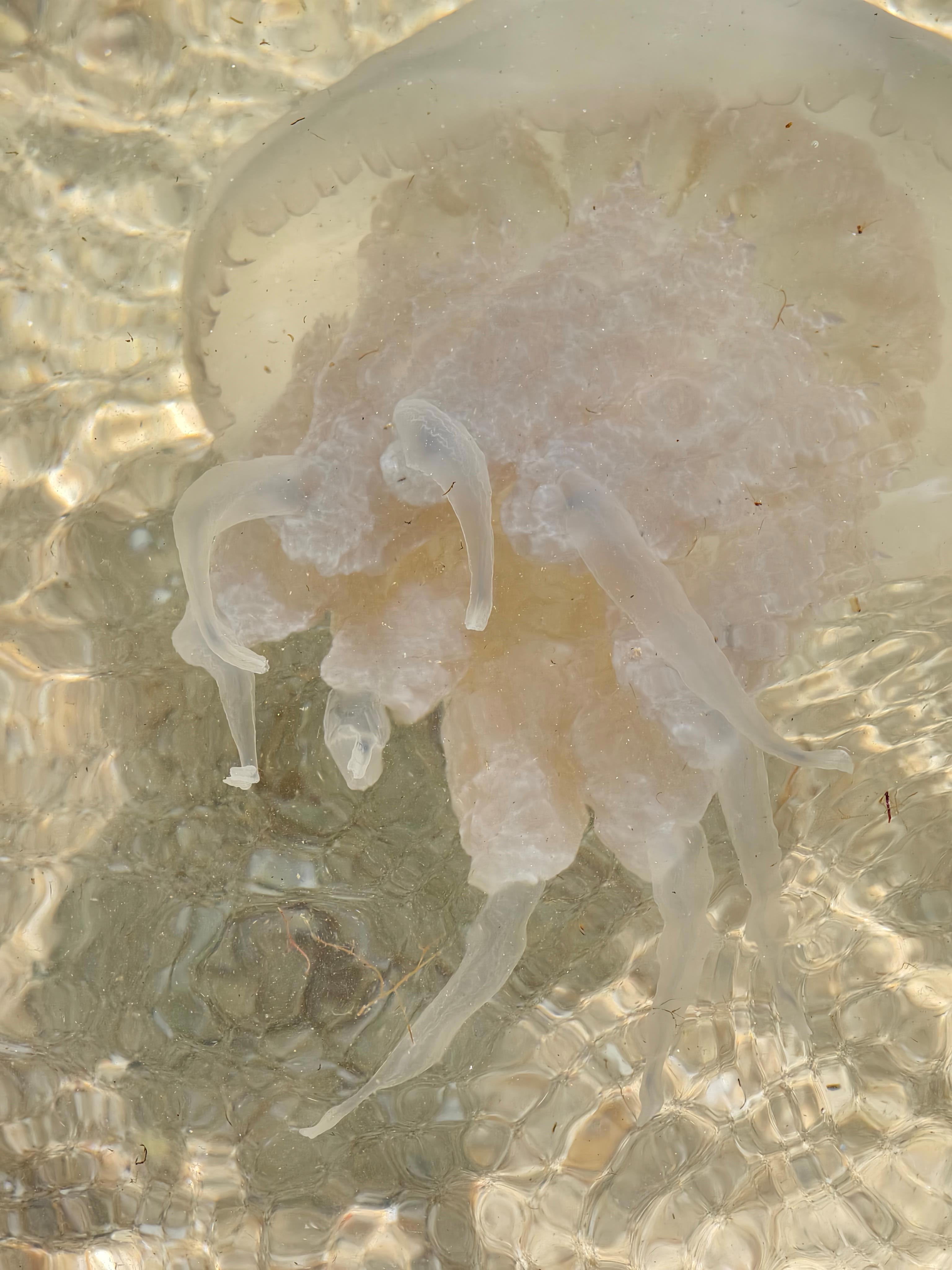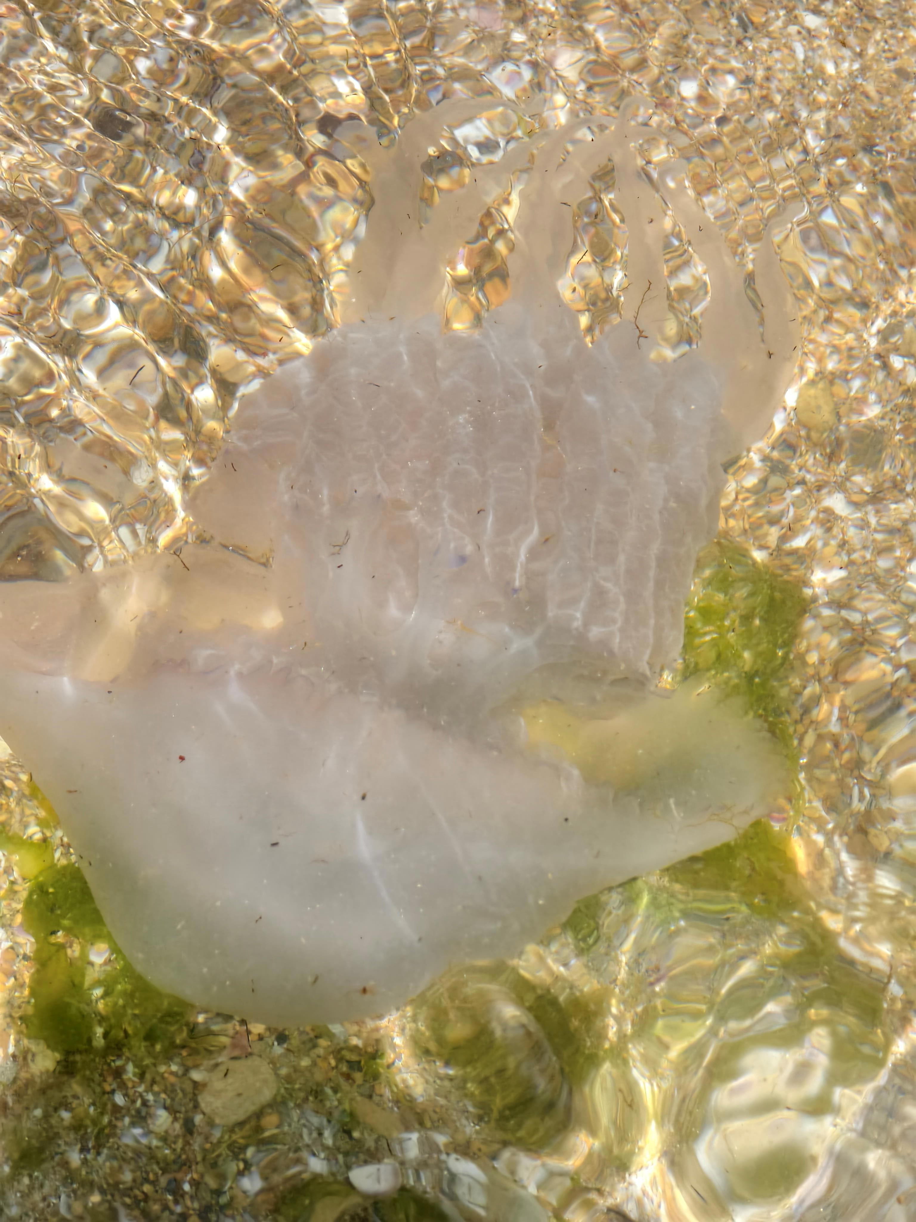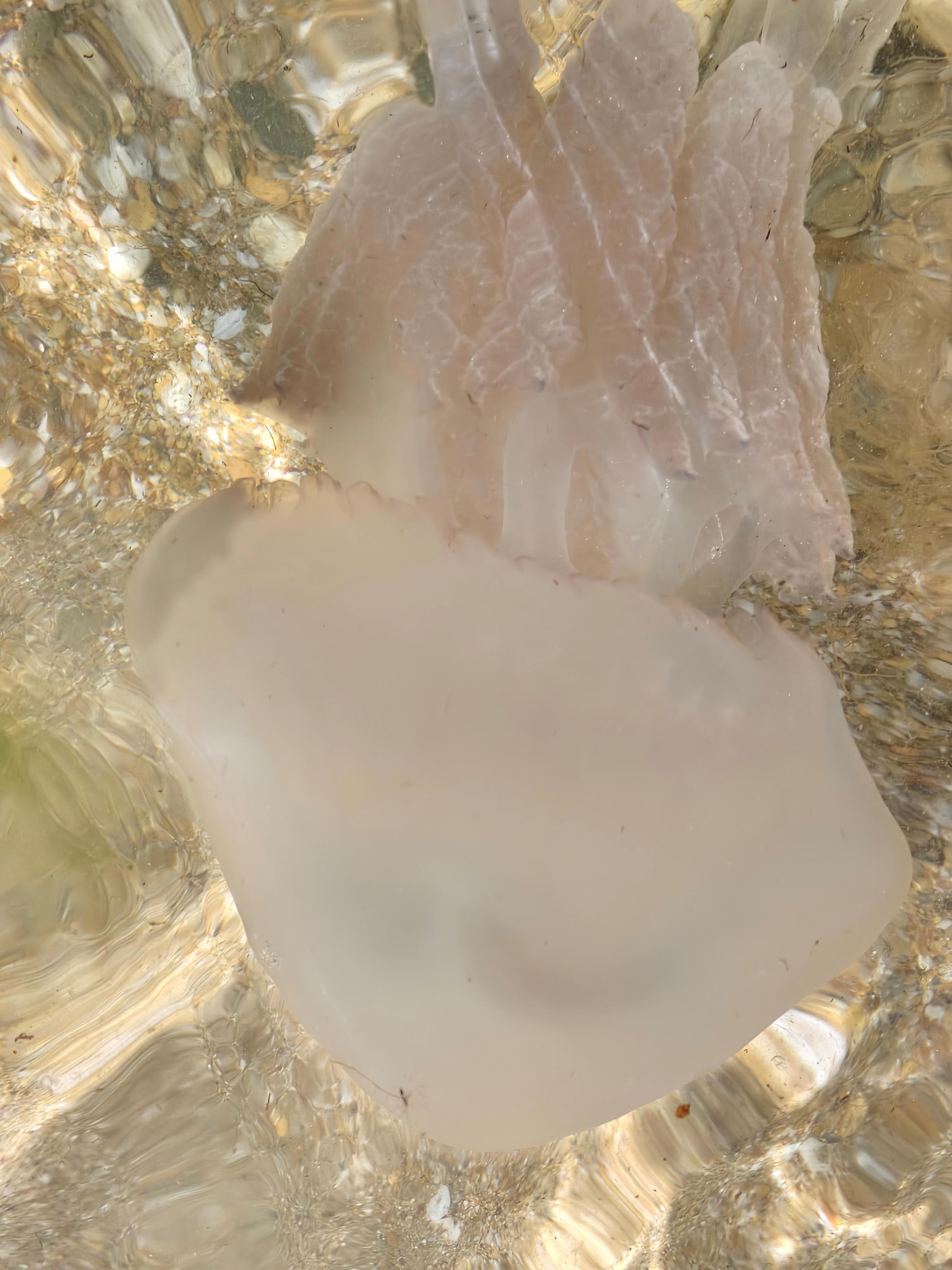 Море потеплело. Но с этим теплом появились медузы. Какие же они разные! Есть полностью полупрозрачные светлые, а есть с розовой или голубой или фиолетовой каймой. Плавать неудобно.