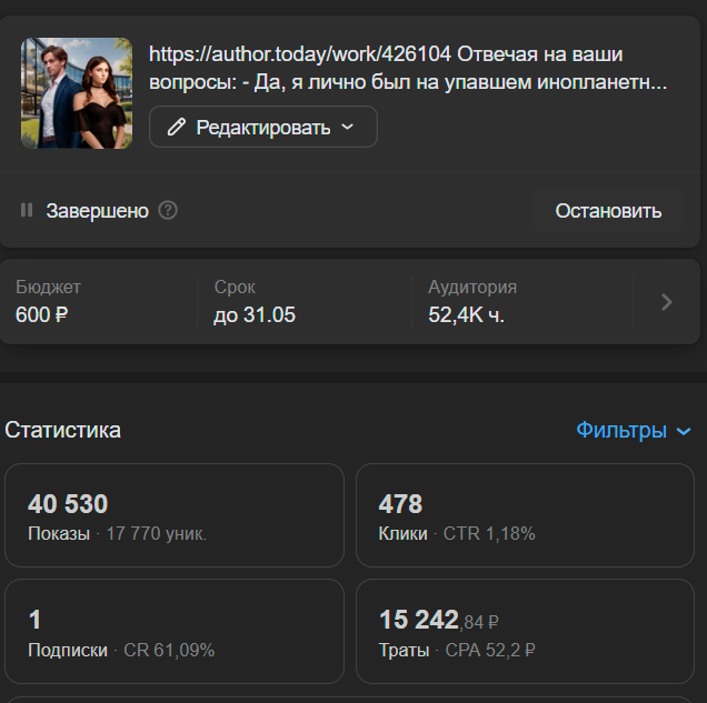 В итоге подписок после рекламной кампании у меня стало на 14 больше. Четырнадцать, Карл! 8 килорублей делим на 14... 571 рубль с копейками. А рекомендация даёт 7-10... бесплатно. Конечно, не бесплатно, мы свои soft skills и fortune со временем вместе переводим в результат. Зато его можно пощупать в деньгах. Ещё момент - 450 библиотек всё равно превратятся в 10-15 читателей. Всё зависит от того, насколько плотная пришла аудитория нужная вам.