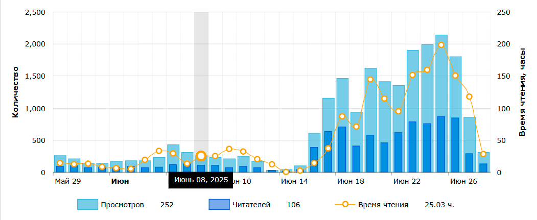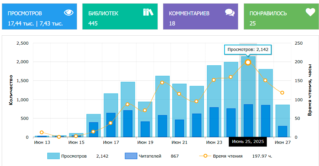 Что интересного заметил в рекомендациях от авторов - интересующиеся личности не скупятся сразу влепить сердечко авансом. Хороший человек посоветовал, а значит - не жалко. В приведённых примерах в первый день не так много библиотек и часов чтения, зато практически точно каждый лайк превратится в подписку. Конечно, это будут не те люди, что лайкнули, но трафик продержится ещё дня 4-5 - сами смотрите по графику.