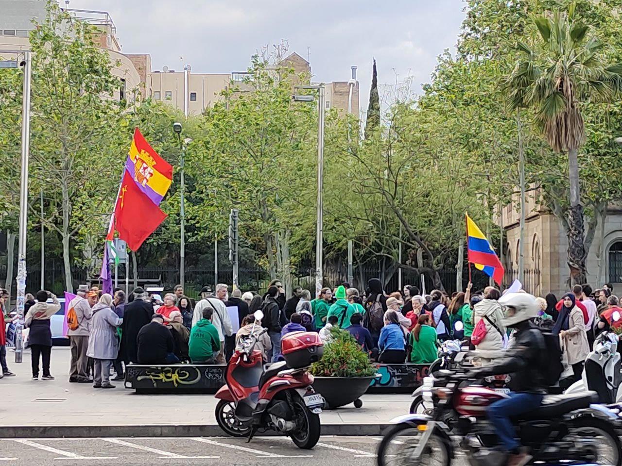 Обратите внимание на длинную "удочку" слева. Нижний фиолетовый флаг - это как я понял какое-то как раз общество пенсионеров. Верхний - старый "республиканский" флаг Испании который был в 1930-х годах до Франко. Тут его опять же используют когда хотят высказать свое "фу" властям. Второй снизу - флаг Палестины, какое отношение Палестина имеет к испанским пенсионерам даже не спрашивайте. Ну и последний - флаг СССР, родной, красный, со звездой и серпом-молотом. Все смешалось в доме Облонских.