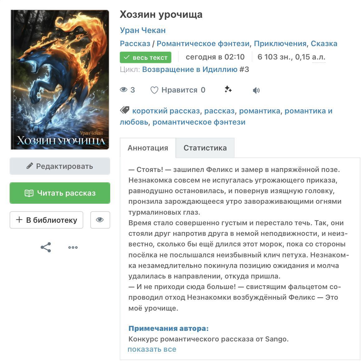 «Хозяин урочища» на Конкурсе романтического рассказа от Sango