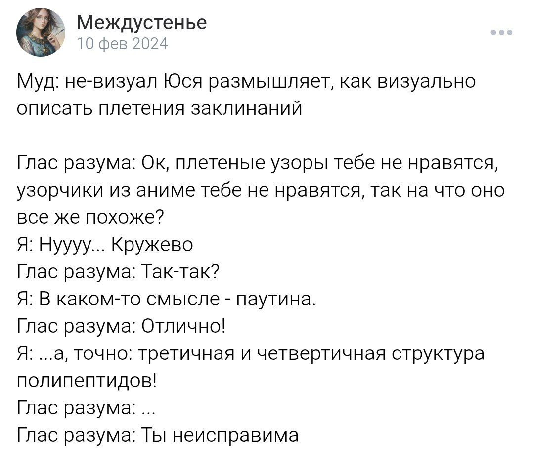 - Форма восприятия - маг видит мир как ткань / код / потоки запахов / фракталы.