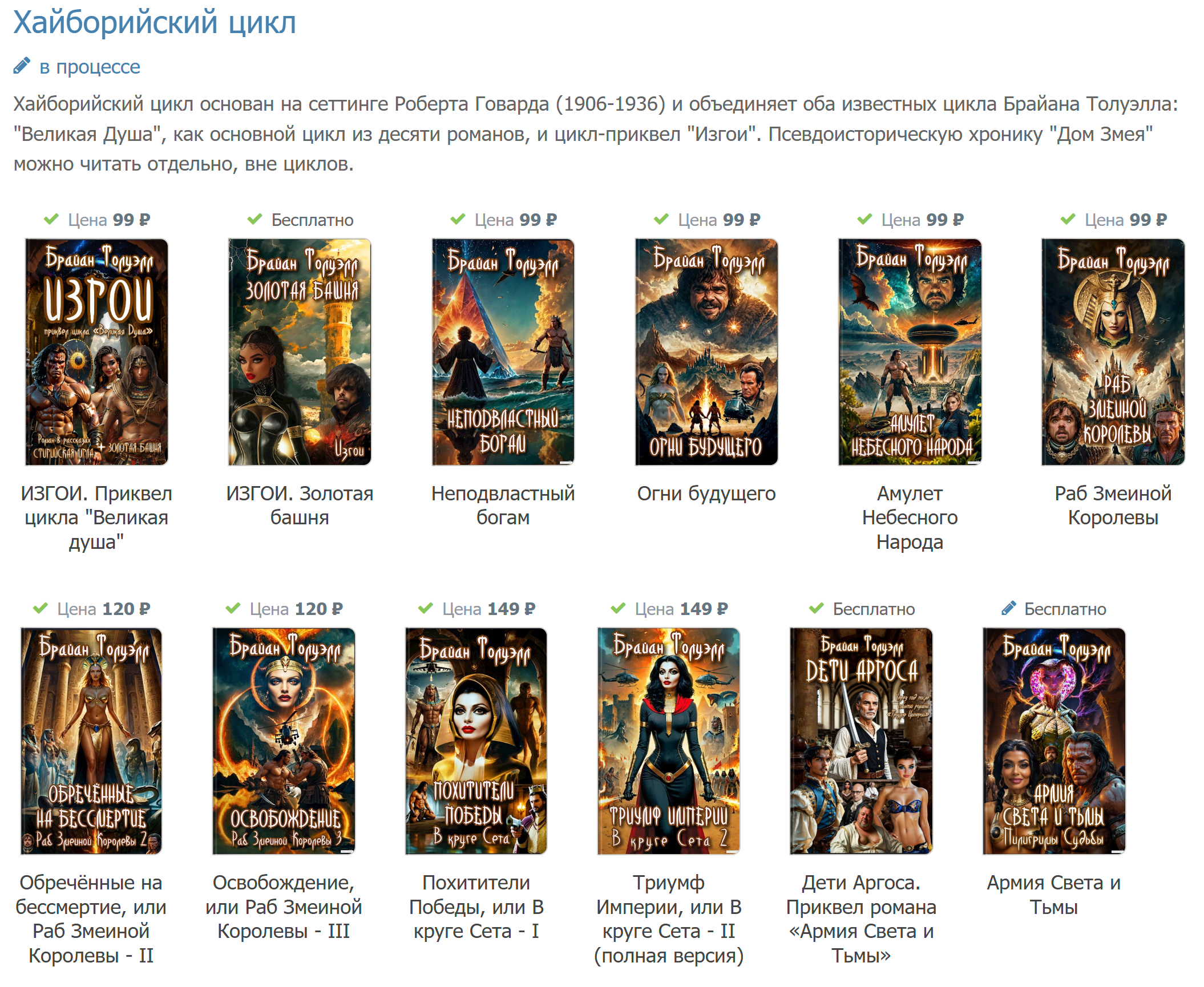 «Хайборийский цикл», который прежде назывался «Великая Душа», появился как фанфик, затем продолжился как апокриф, наконец, стал развиваться как спин-офф Саги о Конане-варваре. Но чем дальше, чем больше цикл Толуэлла отходил от Конана к моим собственным главным героям – Тезиасу, Тхутмертари, Джосеру и, конечно, Камии-Мефрес. Говардовский Конан в цикле Толуэлла участвует, если можно так сказать, скорее для совместимости с мейнстримными версиями Саги.
