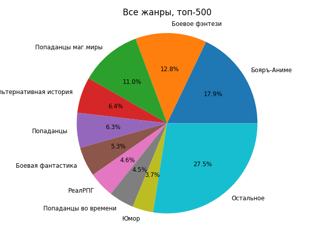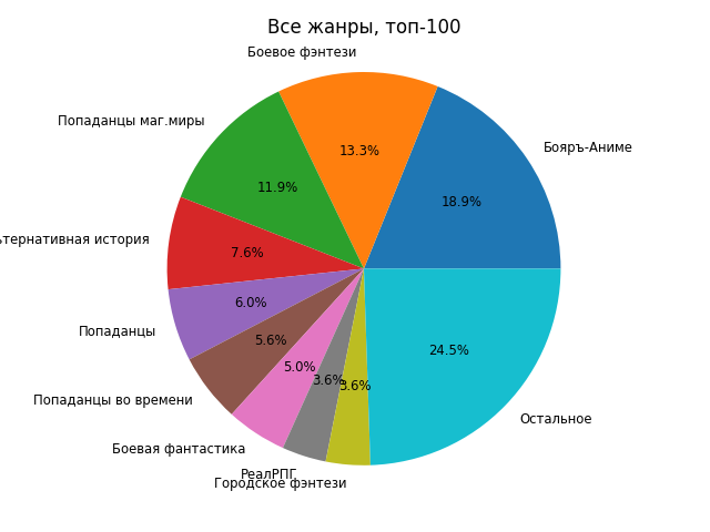 Информация собирается исходя из поисковой выдачи АТ, отсортированной по популярности за месяц: https://author.today/work/genre/all?rp=month&eg=-&fnd=false&page=1 (все фильтры были специально отключены).