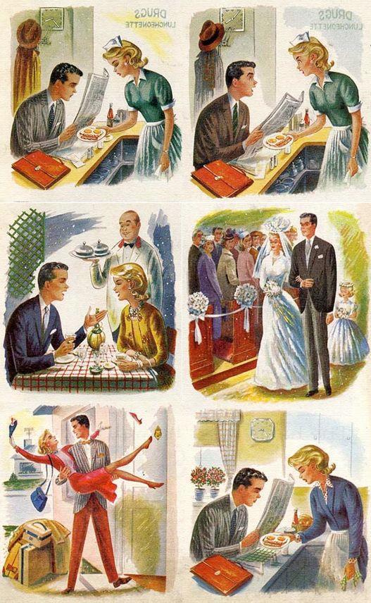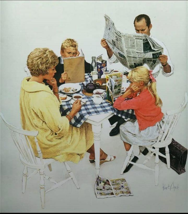 А помните этот образ из середины 20 века, когда семья сидит за завтраком, а папка отгродился ото всех газетой? А иногда и не только он. Совершенно то же самое! (У Бидструпа точно тоже картинки про это были, но искать некогда)