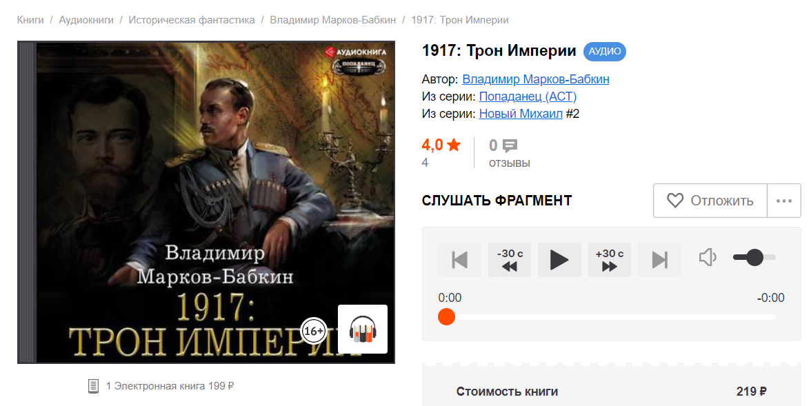 На ЛитРес открыта продажа второго тома цикла "Новый Михаил". Любители аудиформатов могут воспользоваться ссылкой - https://www.litres.ru/vladimir-markov-babkin/1917-tron-imperii-48888602/?lfrom=400978665&ref_key=59040dbd84643eb3a6a3cf8208b76bd9cb579997ec27ae81d6fdf3ad80326ff8&ref_offer=1