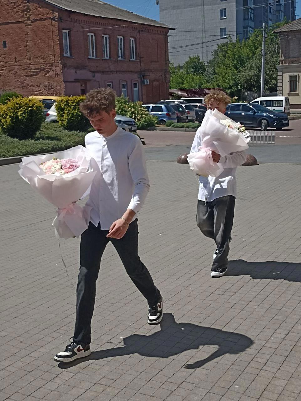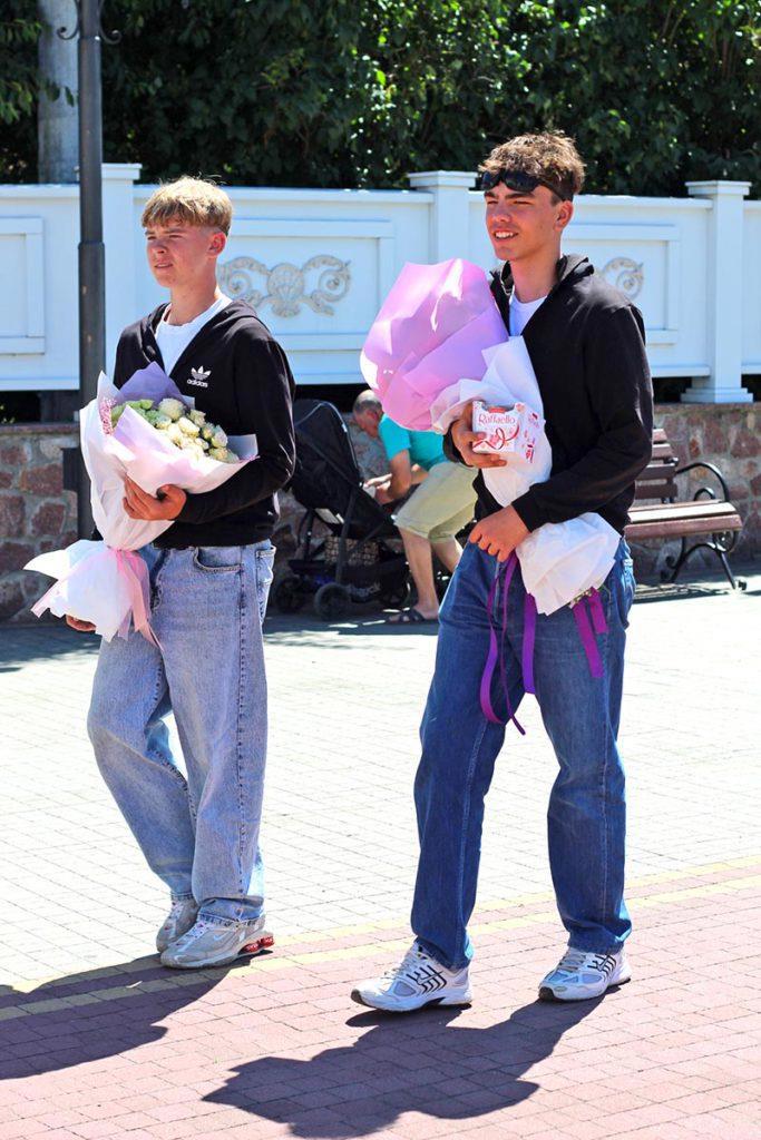 Парни тащат цветы и конфеты, поздравлять своих девушек с выпуском: