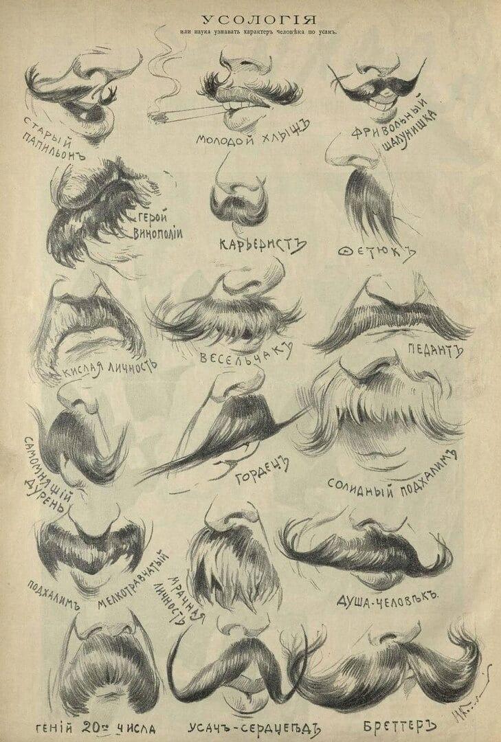 Автор: Олег ПелипейченкоЕсли у вас есть усы (женщин не исключаем, мало ли...), можете узнать, кто вы на самом деле, а не по вашему мнению. В этом вам поможет УСОЛОГIЯ, то есть "наука узнавать характеръ человѣка по усамъ". Ну или можете выбрать желаемую характеристику и отрастить потребные для неё усы, так тоже не запрещается.
