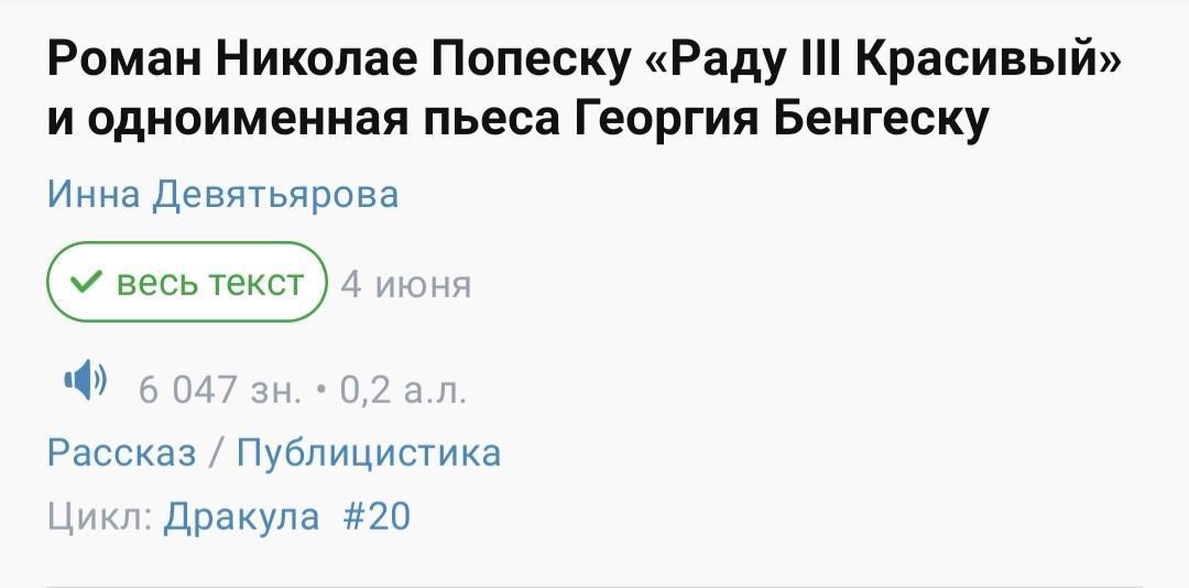 Инна Девятьярова: "Рома Николае Попеску "Раду 3 Красивый" и одноимённая пьеса Георгия Бенгеску"