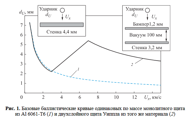 С другой стороны на графике, казалось бы, эффективность щита Уиппла падает после примерно 7 км/с. Вот только это диаметр снаряда, а не его энергия. Снаряды со скоростью 1 км/с и 10 км/с по графику пробивают щит при одном диаметре, вот только у второго снаряда было в 100 раз больше кинетической энергии. Кроме того пробивающая энергия зависит от расстояния между щитами. Т.е. до определенного предела эффективность щита растет быстрее его массы.