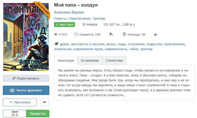 Автор: Алевтина ВараваМы живём на границе миров. Отец сбежал сюда, чтобы провести исследования и написать книгу. Папа – колдун. А я ему помогаю. Хожу в обычную школу, собираю необходимые сведенья. Мне вроде было три, когда мы перебрались, и наш мир я не помню. Но когда-нибудь мы вернёмся, и наша семья станет знаменитой! А пока я стараюсь возмужать, как положено у нас (этим руководит папа), и в здешних реалиях тоже не сдавать, хотя тут случаются сложности...