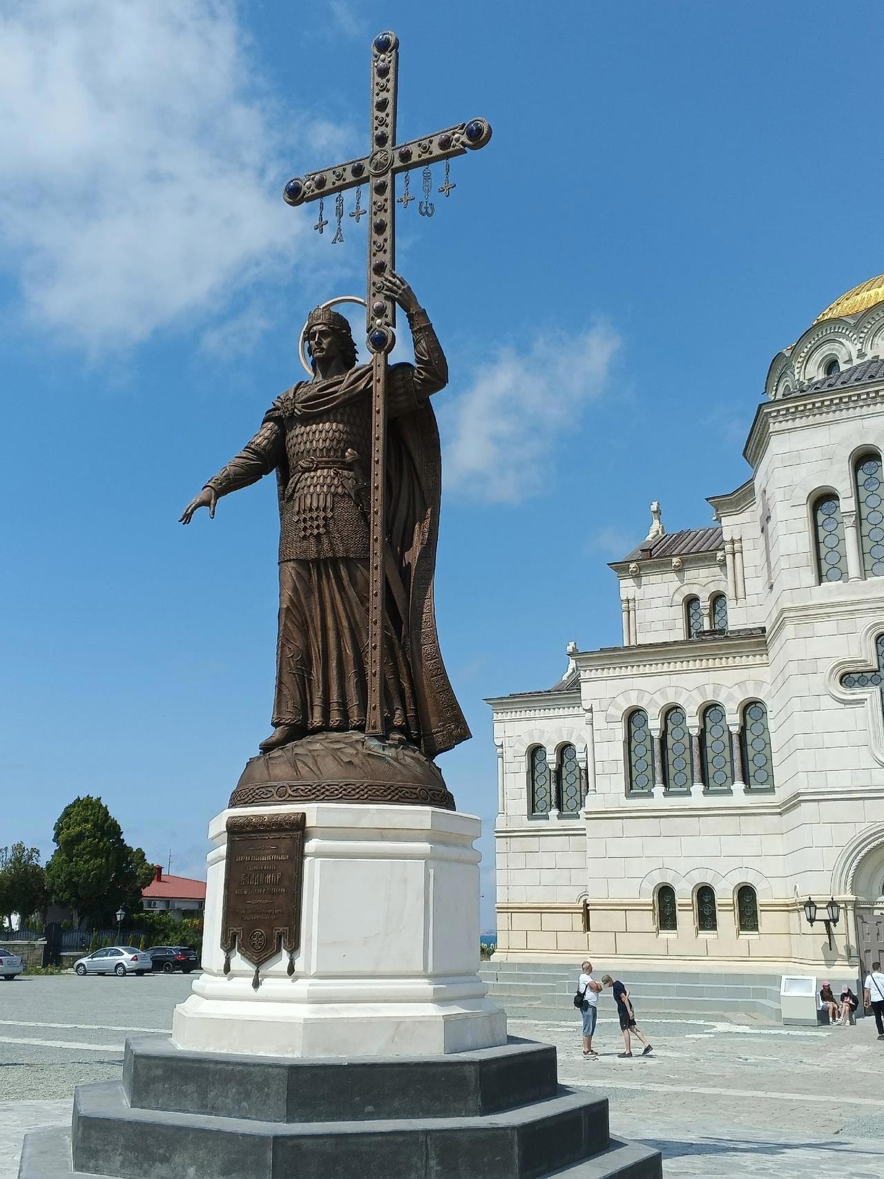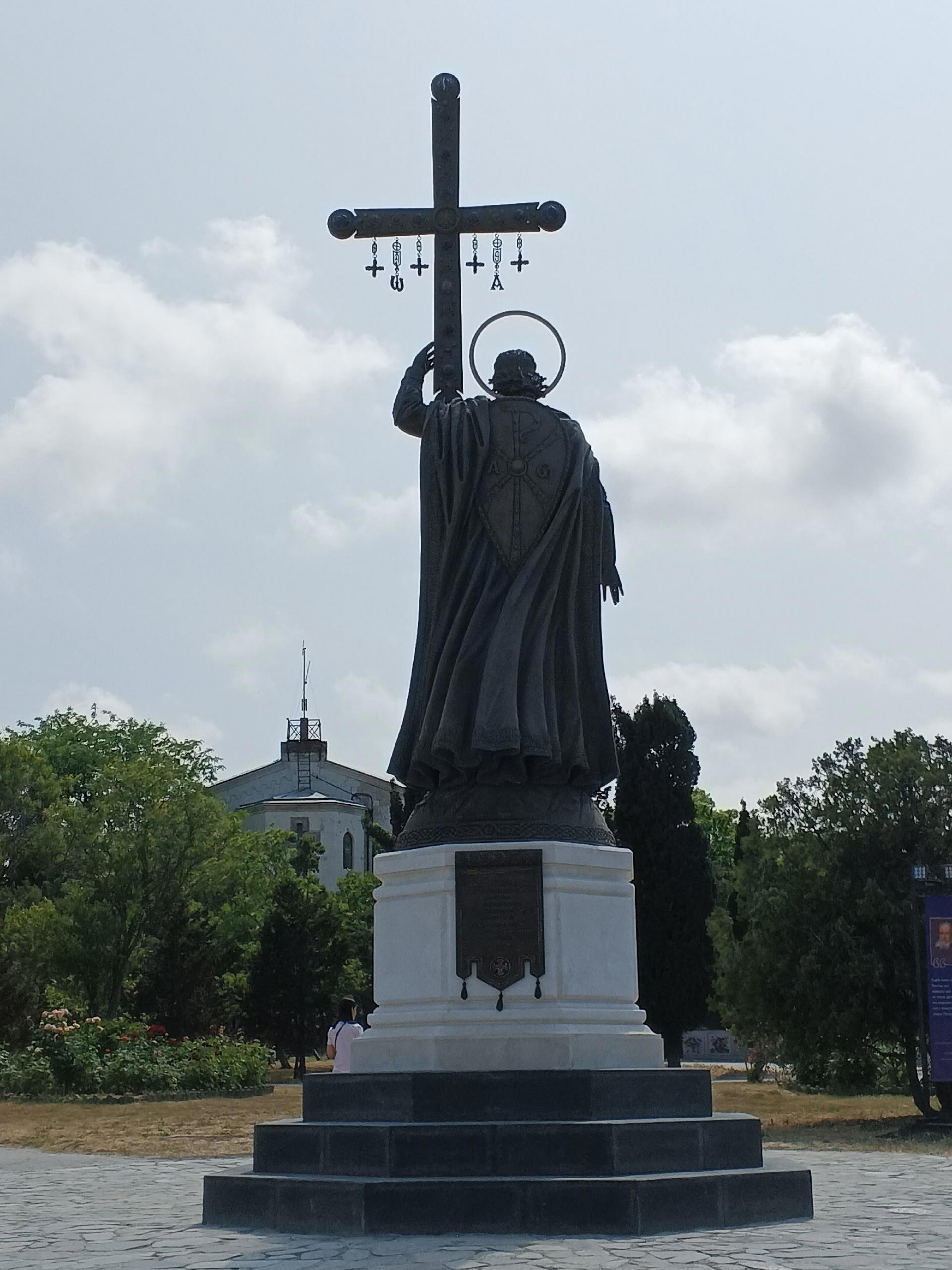 Памятник был открыт 28 июля 2024 года. Стоит он ровно напротив входа в собор. При взгляде издалека крест в руках князя, накладывается на окно западного фасада собора, что символизирует единство прошлого и настоящего. Крест украшен полудрагоценными камнями имеет форму «Корсунского креста», который хранится в Успенском соборе Московского Кремля. А восемь граней постамента это отсылка к купели, в которой принял крещение князь Владимир.